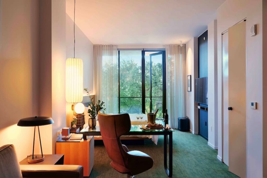 Deluxe room grounds view offers one of Austins largest standard spaces, with relaxing outlooks and thoughtful touches for work and rest. Enjoy Samsung 48 inch smart LED web TV with streaming services, luxury towels, bed linen and bathrobe, stone and glass walk in shower, Nespresso machine, ultra high speed wifi, beverage cooler, microwave, and work desk and chair.