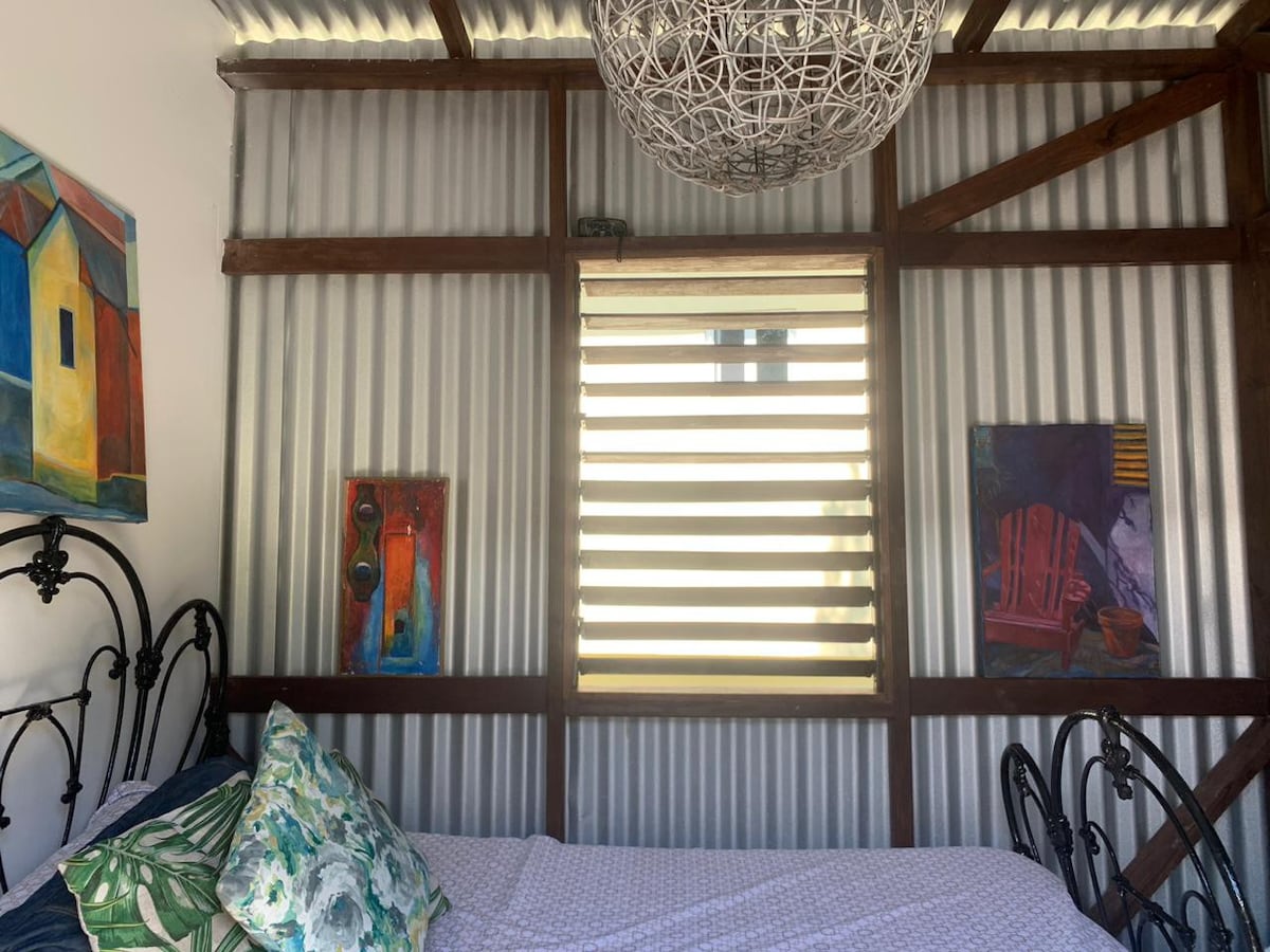 se aconsejan mochilas, 200 escalones cuesta arriba desde el estacionamiento...pequeña casa de campo estudio con ducha al aire libre... terrazas de ventanas... vistas parciales al mar y al jardín. Apreciamos si los huéspedes nos dan una hora aproximada de llegada para ayudarnos a planificar mejor nuestro día...somos más fáciles de encontrar antes del anochecer(6:00 p. m.)y preferimos que los huéspedes lleguen antes de las 9:00 p. m. si es posible... fuma agua solo si en la estufa... la cabaña no está completamente sellada y el lagarto o araña ocasional está allí para controlar los moskitos y las hormigas