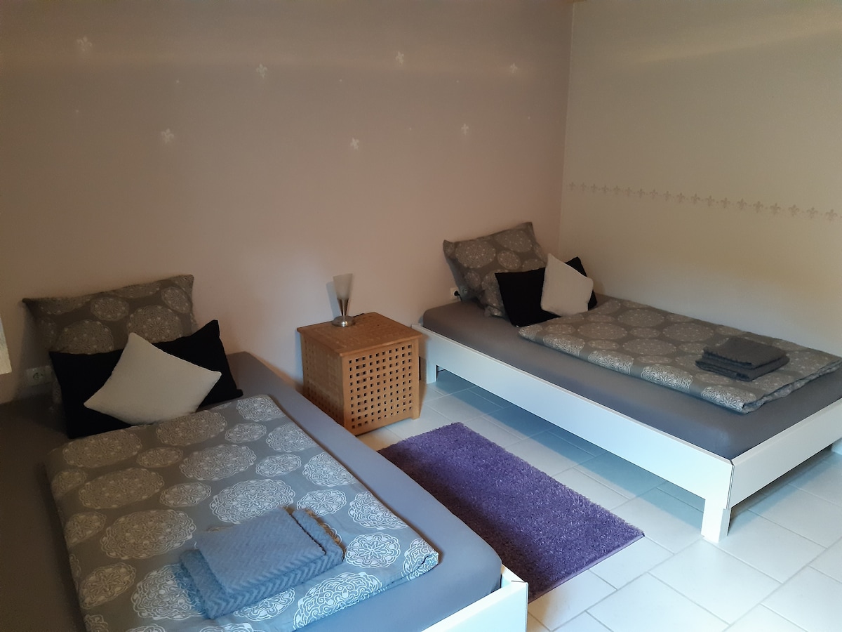 Un departamento con 2 habitaciones, cocina y baño ( nuevo), terraza privada y muebles de jardín. El dormitorio tiene una cama doble. El borde del bosque está a 100 metros. Puedes hacer senderismo desde allí a través del bosque hasta el Mosela. El Eifelsteig está a unos 3,5 km de distancia. También es ideal para recorridos en bicicleta por el Mosela y Kylltalradweg.