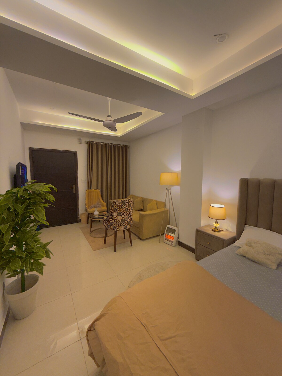 Relájate con la familia en este lugar tranquilo para hospedarte. Descubre tu sereno refugio en el corazón de Islamabad con este luminoso y espacioso apartamento de 1 BHK con vistas al parque y a la montaña, está amueblado para la comodidad y el estilo ideal para viajeros solitarios, parejas o huéspedes de negocios. - Cama tamaño king con TV inteligente (listo para Netflix). - Wifi rápido y confiable tanto para el trabajo como para la transmisión. - Cocina totalmente equipada, perfecta para comidas fáciles. - Acogedora sala de estar. - Decoración elegante y moderna con toques atentos