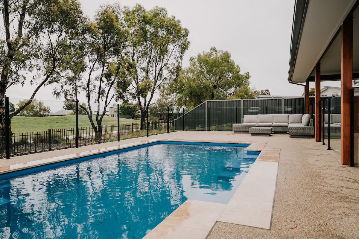 *Alojamiento ideal para eventos en The Sebel* Ubicada a solo unos pasos del lago Mulwala y junto al campo de golf Black Bull, esta nueva y espaciosa casa es perfecta para escapadas familiares o en grupo. Lleno de luz natural, nuestro espacio incluye todas las comodidades que necesitas para que tu tiempo fuera sea muy agradable. Una gran sala de estar de planta abierta con vistas al campo de golf, una cocina bien equipada, almacenamiento de barcos y gimnasio en casa lo hacen perfecto para cualquier persona que busque relajarse junto al lago, con mucho que ver y hacer cerca.