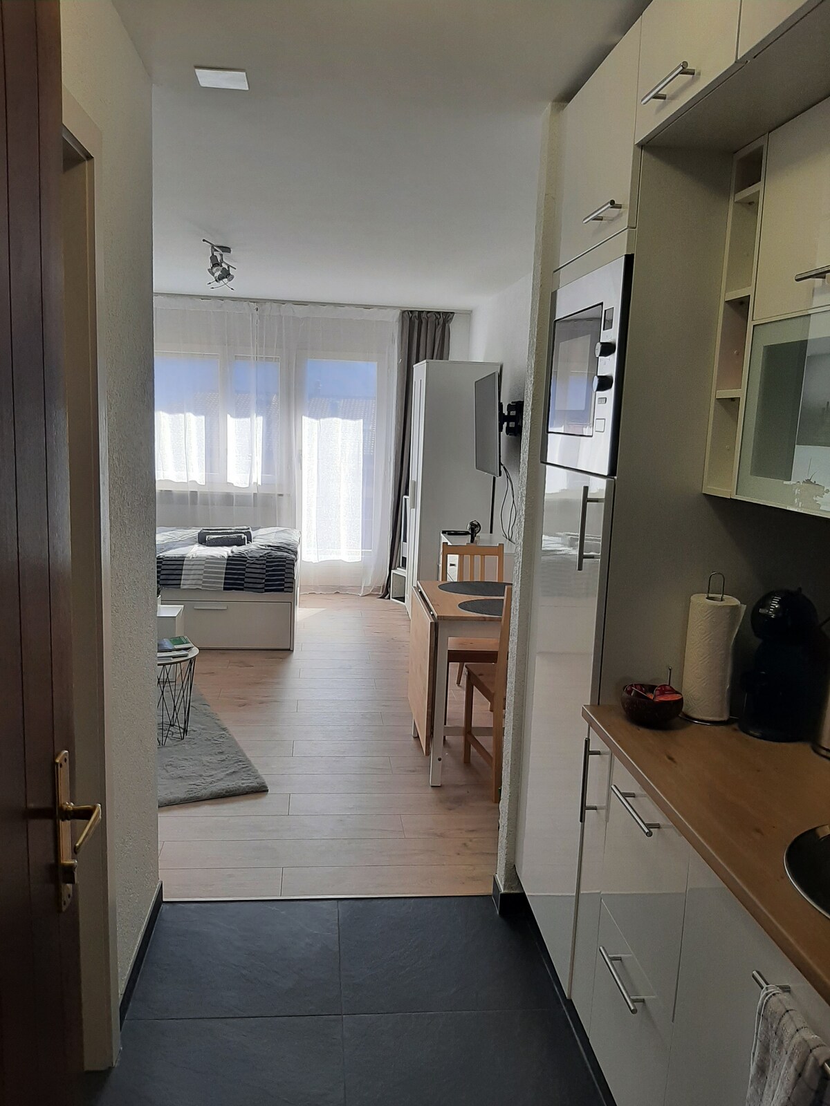 Welcome to Sierre in the Valais Plain, surrounded by the Swiss Alps. The studio with its own entrance is located on the ground floor of our family house in a very quiet neighbourhood about 8 minutes walk from the railway station/city center. The centrally located „Sunshine town " Sierre is the starting point for summer and winter sports lovers. We will be pleased to answer your questions and wishes to make your stay unforgettable and enjoyable. We looking forward to welcoming you.