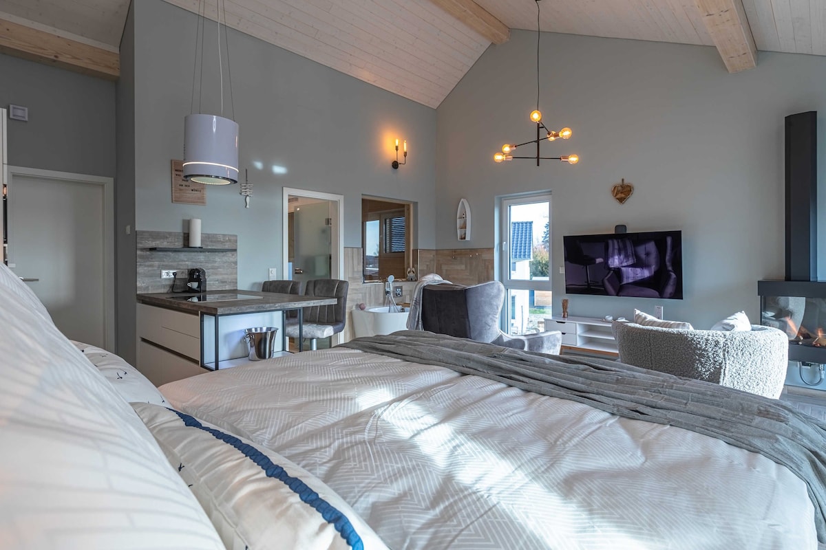 Lujoso apartamento con spa - terraza con vistas al lago, sauna, chimenea de gas y a 60 metros del lugar de baño y del puerto<br/>¡NADA TIENE TANTO SENTIDO COMO UNOS DÍAS EN EL MÜRITZ!<br/><br/> Bienvenido al lujoso loft a orillas del Müritz. Relájese en el ambiente abierto del lujoso loft con sauna privada, chimenea de gas, bañera con vistas al lago y la gran terraza con balcón con vistas al panorama del Gran Müritz. Disfrute de un momento romántico en pareja, lejos de la...