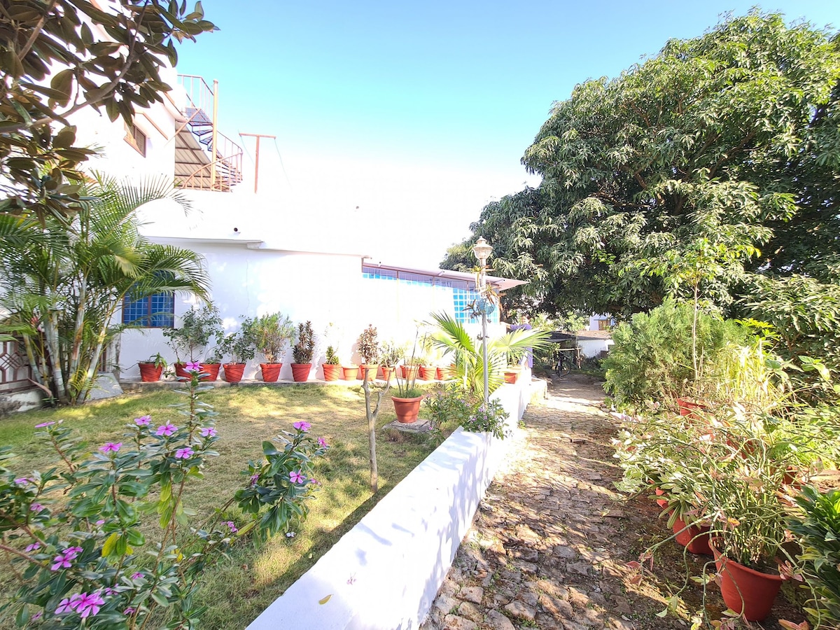 Hola, ¿quieres aire fresco y un entorno verde y exuberante? Bienvenido a nuestro alojamiento familiar. Ideal para familias, niños y mascotas. Habitación limpia con cocina y baño adjuntos, una sala de estar con jardín. Ofrece desayuno de cortesía y wifi también. La tienda médica, los comestibles, los restaurantes y el hospital están a menos de 1 km. El templo de Buda está a solo 1,5 km, mientras que Graphic Era está a poca distancia a pie. Dehradun ISBT está a 3 km y la estación de tren está a 7 km. La distancia a Mussorie es de 42 km.