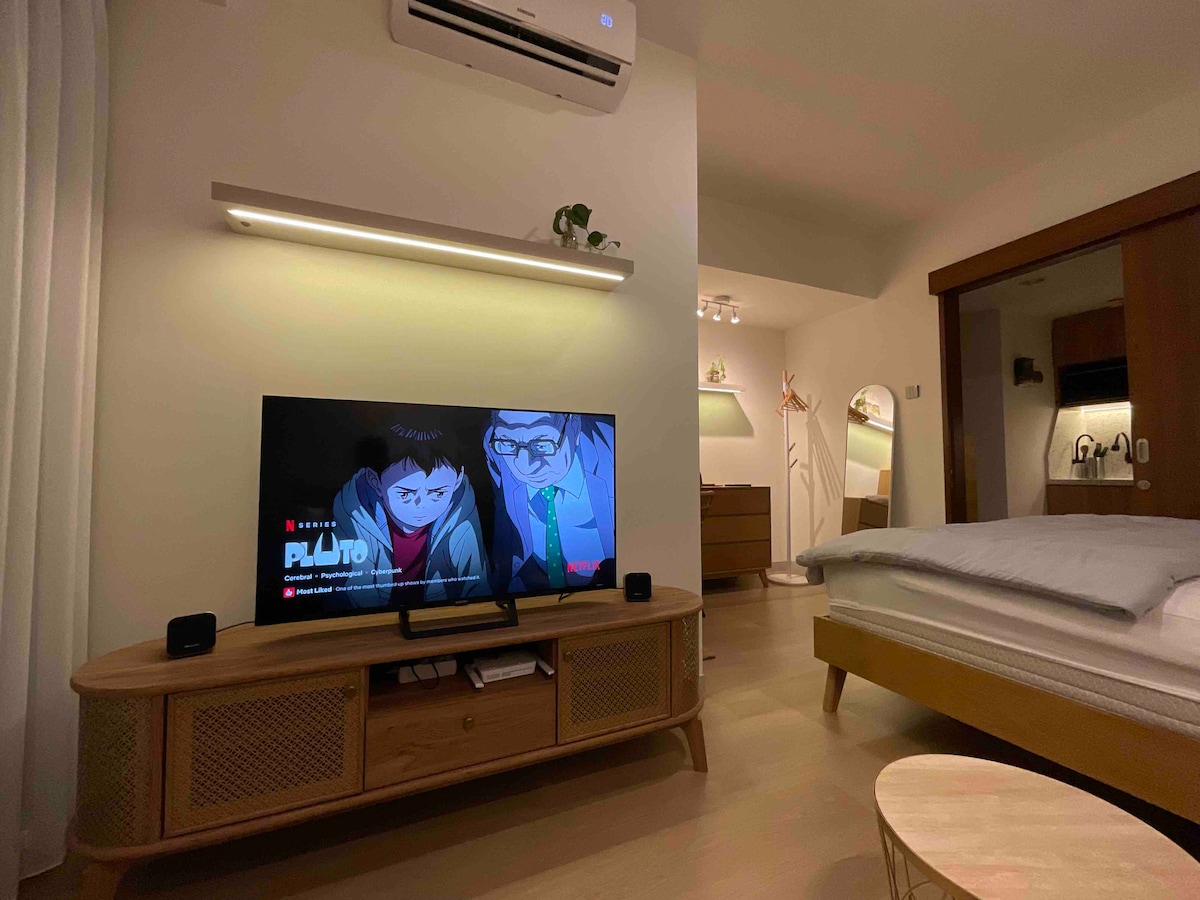 Habitación de apartamento estético con TV inteligente, Netflix y entorno tranquilo en el piso 37. Ideal para estancias vacacionales, trabajo desde casa o creadores de contenido. Instalaciones: Smart TV Netflix Minicine en casa Kitchenette Wifi 5G Secador de pelo.