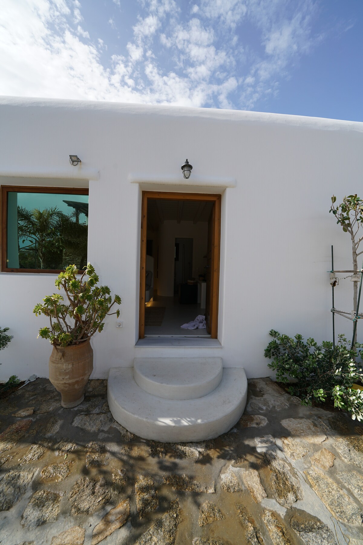 Casa completamente nueva y elegante. La renovación se terminó en marzo de 2023. La casa se encuentra en un centro vacacional privado frente al mar. Cuenta con su propia playa privada (acceso solo para los huéspedes del centro vacacional), piscina con agua de mar, canchas de tenis y baloncesto, restaurante y aparcamiento privado que todos pueden utilizar de forma GRATUITA. Nuestra casa se encuentra a solo 10 minutos del centro de Miconos. Tiene su propio balcón, aire acondicionado y wifi rápido. Apartamento ubicado en un segundo piso.