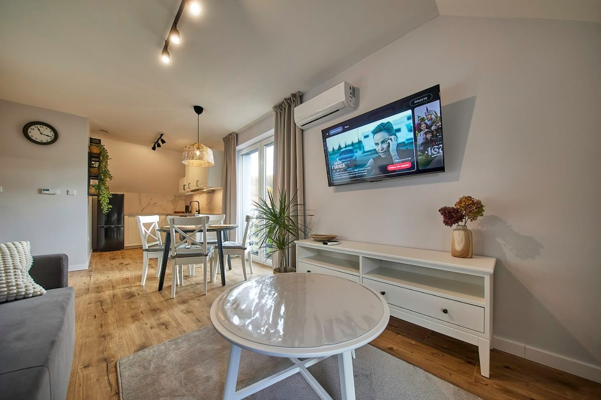 Apartamento moderno de dos camas en el primer piso de 80 metros cuadrados con cocina, baño, sala de estar con balcón. El dormitorio 1 tiene una gran cama doble. El dormitorio 2 tiene una cama doble o dos camas individuales. El apartamento tiene capacidad para cuatro personas muy cómodamente y ofrece vistas panorámicas de las montañas Beskidy. El balcón está amueblado con mesa y sillas. También hay una terraza solárium y nuestro propio viñedo.
