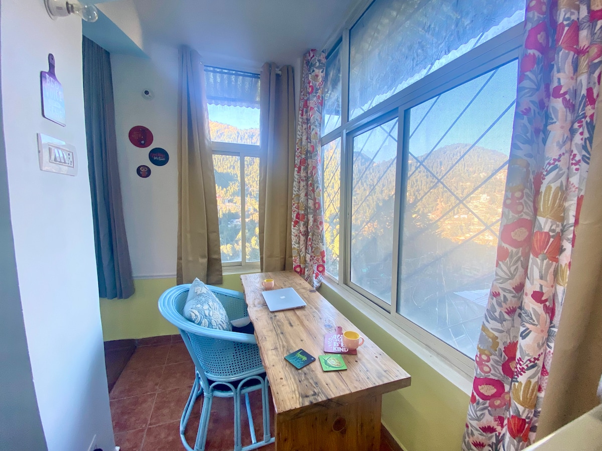 Este lindo apartamento de 1 dormitorio y cocina es una escapada perfecta para familias/parejas/amigos, tiene un ambiente acogedor vintage/moderno. Tiene una vista abierta de dos lados del Himalaya. Está lejos del ruido, pero a diez minutos en coche del centro comercial Rd, o a 20 minutos a pie del lago. Está equipado con todas las comodidades modernas. Un lugar perfecto para relajarse, contemplar las montañas o animarlo con música y películas por la noche en una televisión de 43 pulgadas y una estación de trabajo dedicada. ¡No puedes pedir más!