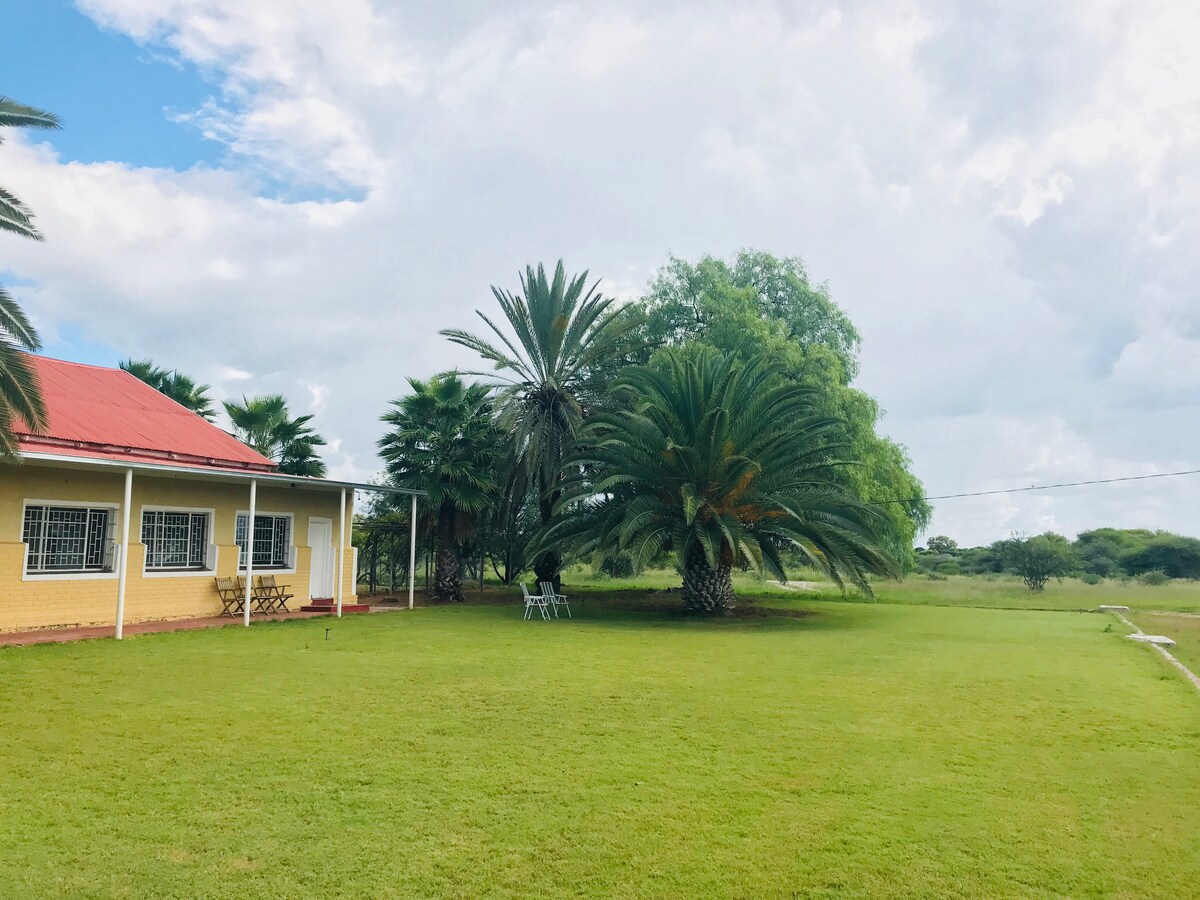 Disfruta de una estancia única en una granja histórica en una granja de ganado tranquila y pintoresca. Puedes prepararte la comida o podemos proporcionarte la cena. La casa de campo es ideal tanto para estancias cortas como largas y ofrece una hermosa piscina, wifi rápido, áreas de trabajo, un espacio infinito para ti y un estanque cercano que atrae a una variedad de aves y vida silvestre. Situado a 1 km de la A3, entre Ghanzi (Gantsi) y D'kar. Ambos dormitorios tienen aire acondicionado, camas tamaño queen y baño privado.