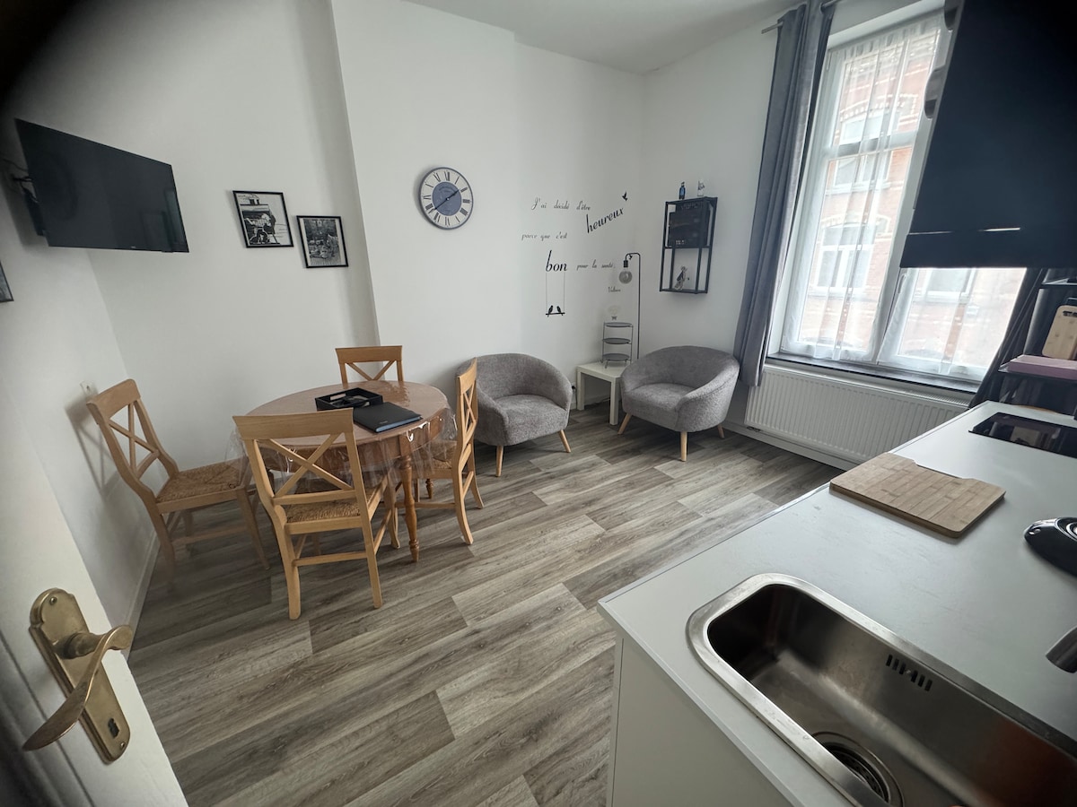 Le ofrecemos nuestro nuevo apartamento en el primer piso «Le Moulinsart». Acceso independiente, calle tranquila con aparcamiento gratuito en la calle. Una sala de estar con cocina equipada, zona de comedor y zona de estar, un dormitorio grande con dos camas y un baño grande con ducha y bañera. Una gran pantalla con Netflix, YouTube,... en el dormitorio y un televisor en la cocina. Zona de escritorio con wifi. Todo esto a 15 minutos andando del centro de la ciudad. Se admiten perros pequeños bajo petición.