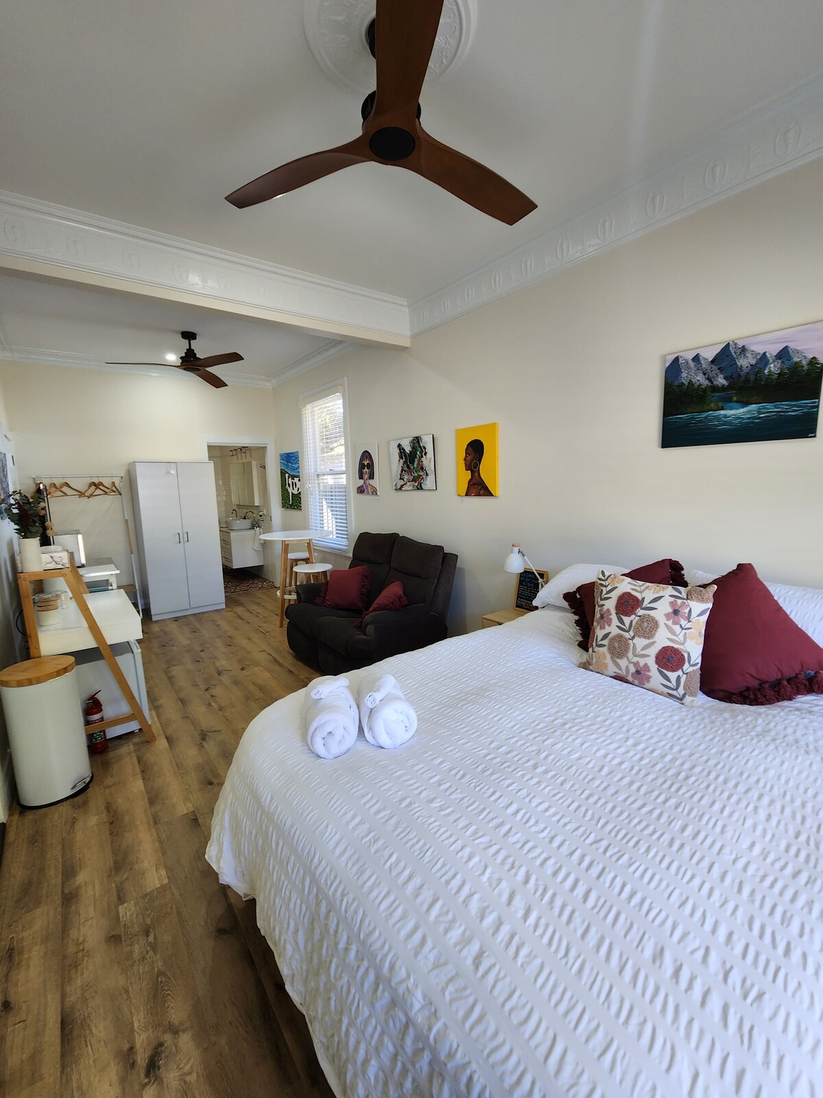 El Gilded Globe es pintoresco, peculiar y lleno de carácter en lo que respecta a los apartamentos patrimoniales. Está situado en la parte trasera del edificio y cuenta con tablas de suelo pulidas originales y una estética selvática atrevida pero relajante, con mucha textura y atractivo decorativo. Este estudio tiene una pequeña cocina de planta abierta, comedor, sofá y cama tamaño queen con ropa de cama Sheridan, ¡así como su propio pasillo a ninguna parte! Tiene una ubicación céntrica en la calle principal de Leeton (a 1-5 minutos a pie de cafeterías y restaurantes) y aparcamiento seguro.