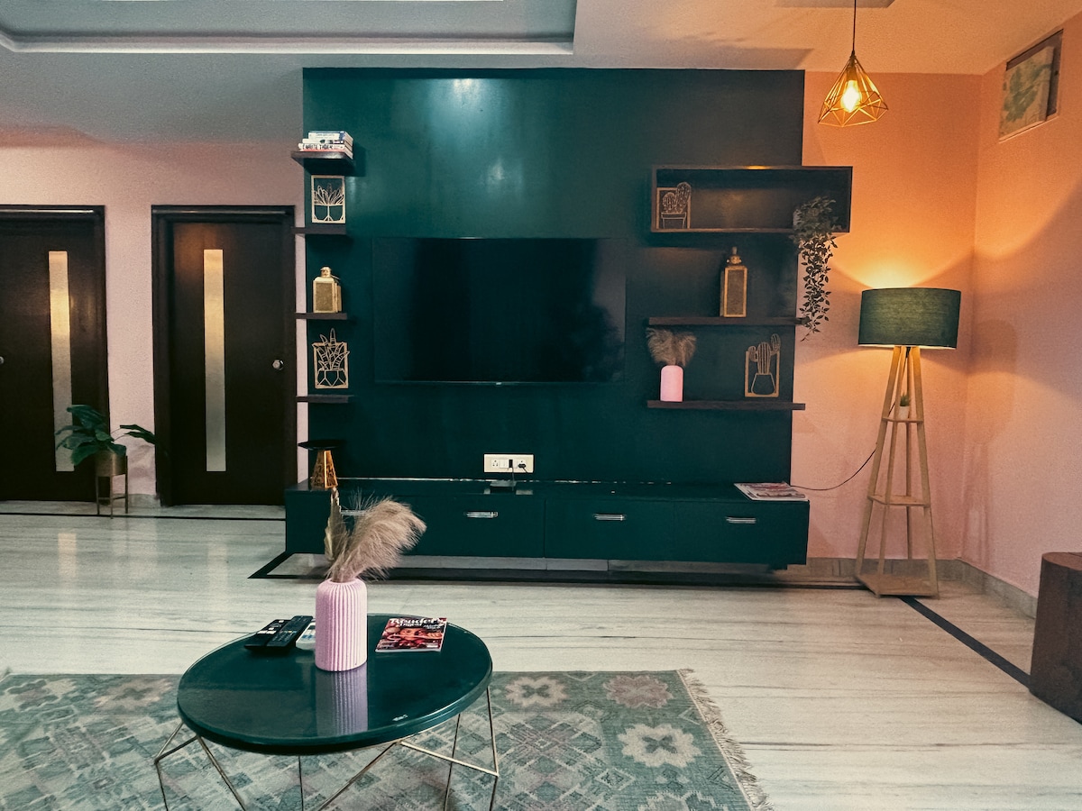 Lujoso, acogedor, aislado y a solo 5 minutos de Hi-Tech City, este apartamento de planta completa en el segundo piso es perfecto para: - Familia de 2-15 personas, huéspedes de bodas, NRI, etc., que necesitan un alojamiento céntrico y servicio de limpieza diario. - Empleados que trabajan a distancia que necesitan wifi de alta velocidad, una cocina totalmente surtida y energía de respaldo del inversor. - Parejas que quieren una escapada de corta duración y relajarse frente a un televisor inteligente 4K de 50pulgadas . - Amigos que necesitan un lugar privado para pasar el rato en la ciudad. LLEGADA AUTÓNOMA con cerradura inteligente