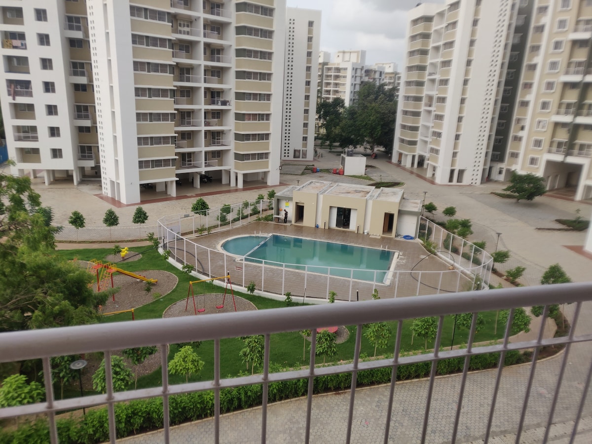 Relax with the whole family at this peaceful place to stay. Anāhat | We - Host All The 5th floor apartment is near to heaven facilitated by modern amenities. The furnished apartment is with 2 bedrooms, hall and kitchen with 2 balconies facing blue skies in middle of lush green setting of nature. We provide AC, you decide to ‘On’ it or otherwise. The maximum occupancy could be 6 Adults. No more. Please check the list of facilities.