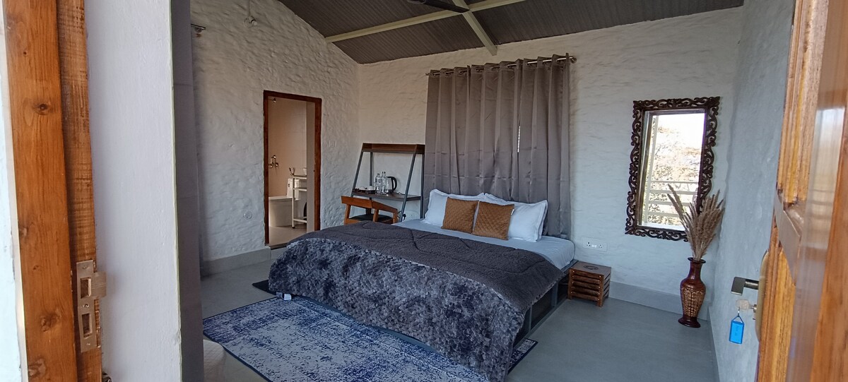 La propiedad, Cabaña 62, está rodeada por el espectacular paisaje de las montañas del Himalaya. La cabaña 62 está cuidadosamente diseñada utilizando los materiales locales, predominantemente la madera de cedro y las piedras locales, que te ayudan a mantenerte enraizado en la tierra montañosa, reflejando el lujo descalzo. La cabaña 62 ofrece un dormitorio individual con baño y un dormitorio doble con baño. Ambas habitaciones se pueden alquilar por separado o juntas. El precio mencionado son de dos dormitorios y una sala de estar, pero estarán encantados de alojar habitaciones individuales también.
