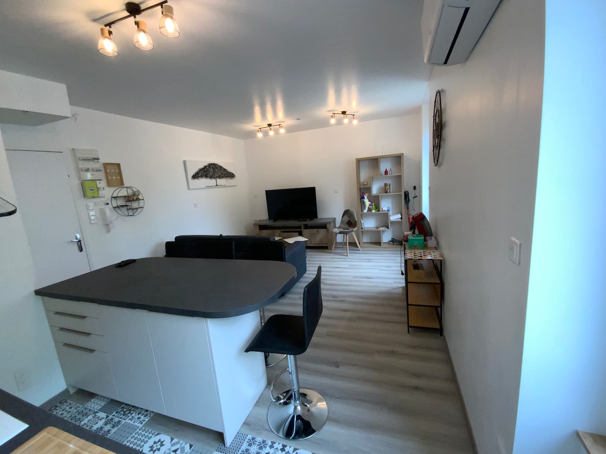 Venga a este alojamiento de 30 m² con planta baja con cocina/sala de estar con sofá cama y dormitorio abierto arriba con cama de 160 cm, ducha y aseo independiente. Una bandeja de bienvenida le espera con té, café, zumo y pasteles. Se puede aparcar en el patio privado. Terraza que da al jardín Situado en las laderas de la colina de la Motte, a 150 m del centro de la ciudad y del tribunal, ¡es el campo en la ciudad! Entrada independiente Posibilidad de alquilar con el Mini Garni Vendemiaire 1 habitación más.