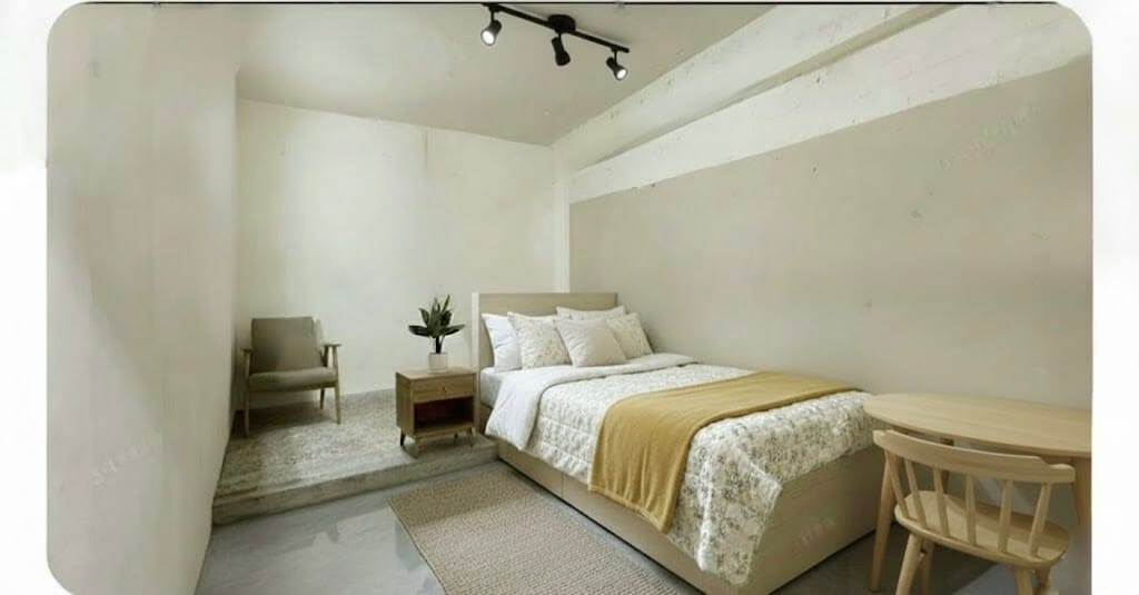 Este lugar único es único en estilo. Además de toallas y cepillos de dientes, se proporcionan artículos de aseo Hay una cama individual en la habitación, un sofá de estilo japonés, un proyector, enchufes USB y tipo C, un armario abierto, una pequeña mesa de maquillaje y una cuerda de secado en la habitación... No tiene ventana. El sistema de aire funciona bien y funciona en la habitación. Solo trae tu propia toalla y cepillo de dientes