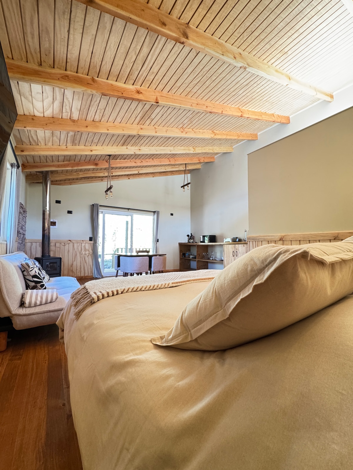 La cabaña incluye: Dormitorio (cama 2 personas) Baño Cocina equipada Mininevera Sala principal : incluye la cocina y el salon Sofá convertible (2 personas) Mesa de comedor con 4 sillas Televisión (sin canales, SmartTV + dvd) Horno a gas Estufa a leña Terraza Parrilla exterior Paquete de inicio incluido: Sábanas Toallas 1 rollo de papel higiénico Jabón para platos Fósforos 1 bolsa de basura (Baño + Cocina) Esponja reutilizable 1 paño de cocina Jabón para manos El agua es potable del grifo.