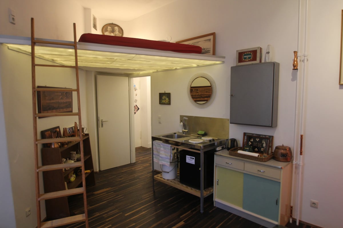 Integrado en la vida del vecindario de Berlín, nuestro antiguo estudio/galería fotográfica es un pequeño y acogedor apartamento estudio a la altura de los ojos con el Neukölln Kulturmilieu. A pesar de la ubicación céntrica, el apartamento es muy tranquilo y cerrado con llave, por lo que puedes hacer una pausa de la vida callejera. Está equipado con una cama loft (área de 160x200 cm), un sofá cama (120x200 cm) y mini cocina (dos superficies de estufa, nevera pequeña, hervidor de agua, ollas, etc.), una mesa con tres sillas y una sala de estar.