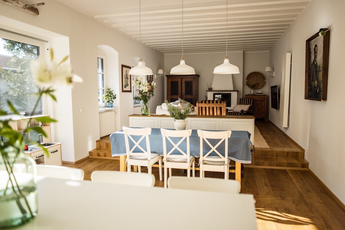 En el borde tranquilo del bosque se encuentra el aspecto modesto desde el exterior Casa de madera. En la planta baja, junto a dos dormitorios dobles, un baño con ducha e inodoro y una cocina totalmente equipada también hay un comedor y una sala de recreación. A través de una puerta, también se puede acceder a la terraza y a la el jardín. En el primer piso, encontrarás dos habitaciones dobles más y un baño con ducha e inodoro, también una cocina, sala de estar y comedor. Ambas cocinas están totalmente equipadas.