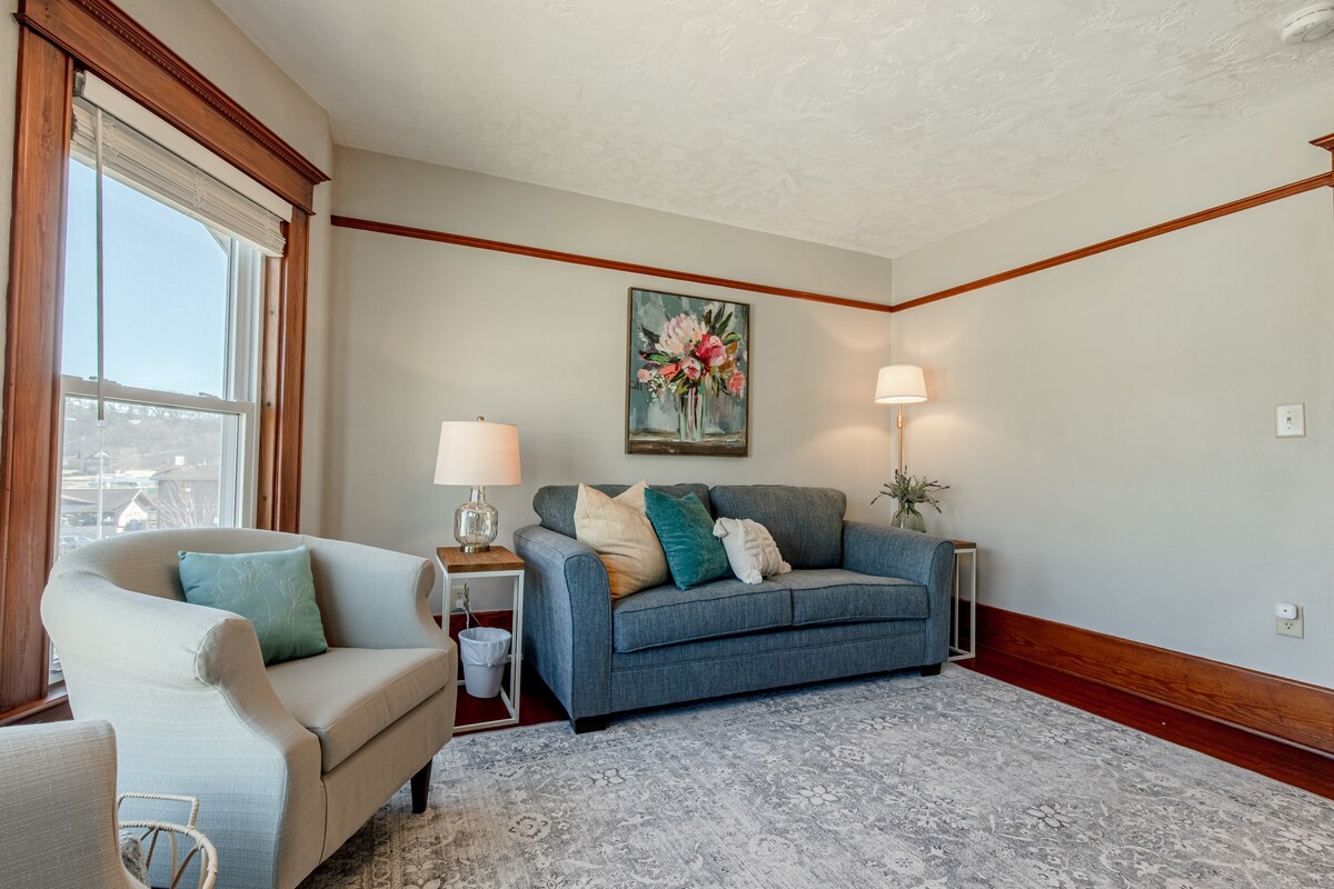El loft 3 está 40 escalones (2 tramos de escaleras) por encima de Monroe Square. Es una subida, ¡pero las vistas valen la pena! Recientemente remodelado en 2021, y que recuerda el carácter de 1859 del edificio, este espacio es lindo, acogedor y verdaderamente único. Literalmente a un par de pasos de tu entrada se encuentra Sunrise Donut Cafe, con donuts personalizados y un menú completo de excelentes artículos de café. Desde allí, explora el resto de la plaza para comer, beber y comprar en un pintoresco ambiente de Main Street.