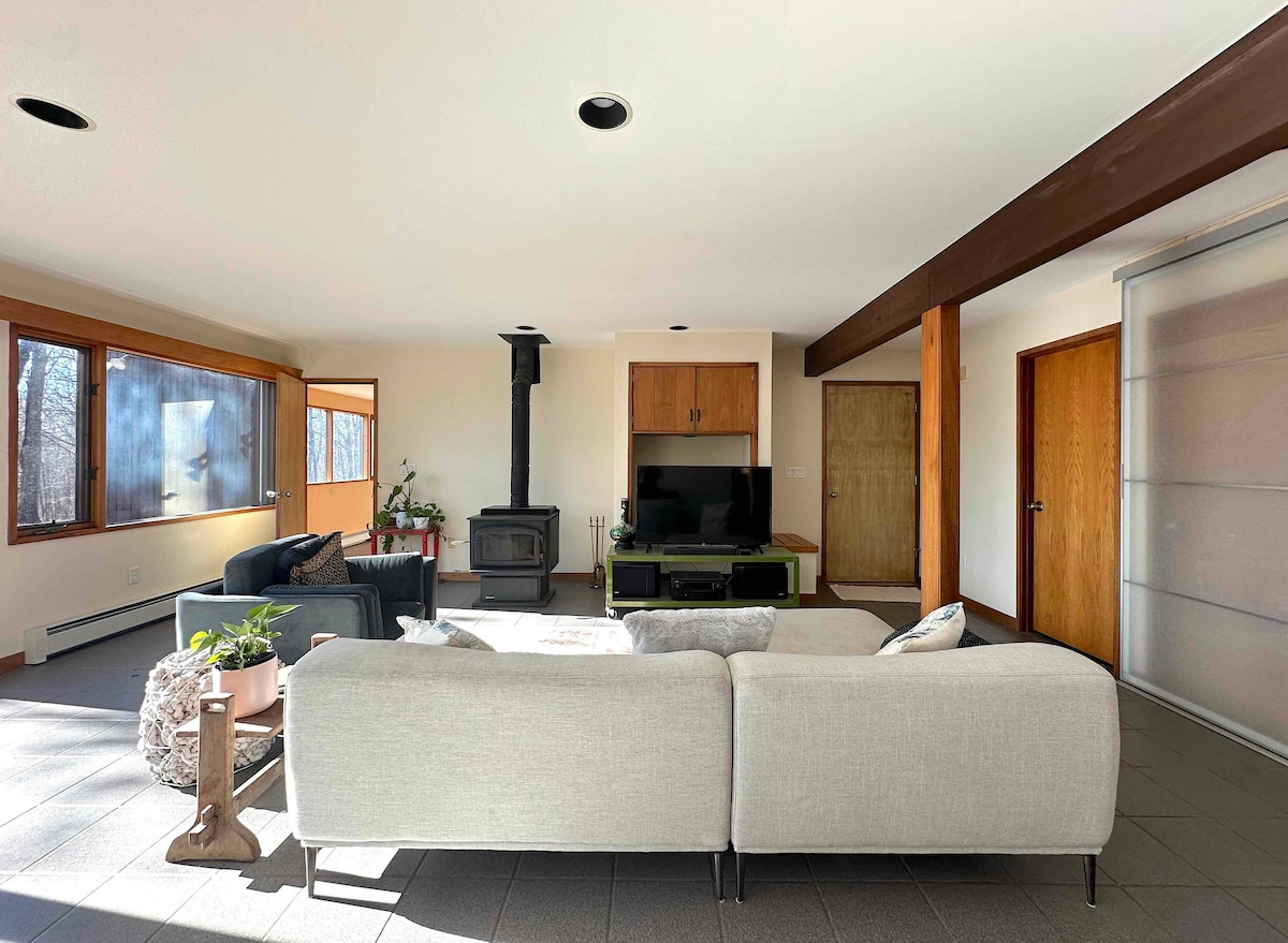 Our barn is in a large field on lot next to our home. Our rental area is upstairs which offers beautiful views of our field and the visiting deer. The eclectic decor is accumulated from years of activism. Our guest room and bathroom are newly renovated. It is a quiet and peaceful area near two state parks. We operate a mail order business in the downstairs area but will not be working while guests are staying with us.