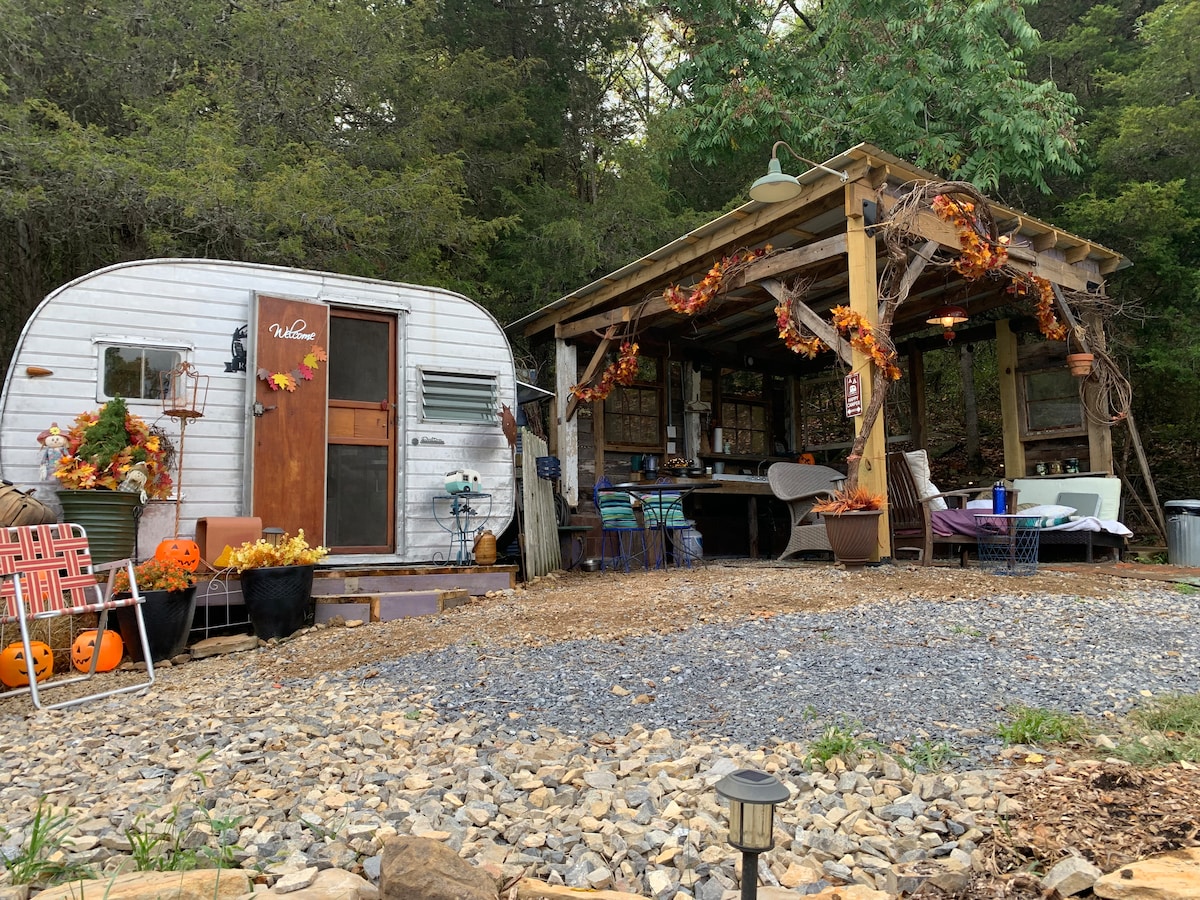El Roam Inn ofrece aventuras Boho Glamping y Farm-Fun en Big Cedars Farm. Esta caravana viajó por el sendero de Oregón...sí, la recorrió Y apareció en un blog...antes de que se pusiera aquí, enclavada en la meseta que llamamos Billy Goat Bluff. Una "minicasa" original, tu estancia inolvidable incluye: amistosas interacciones con animales, amaneceres matutinos de nuestro actualizado Dalton "Canned Ham" de 1959, impresionantes vistas desde la cocina al aire libre, electricidad, agua e incluso una ducha caliente en el privado estilo hobbit.