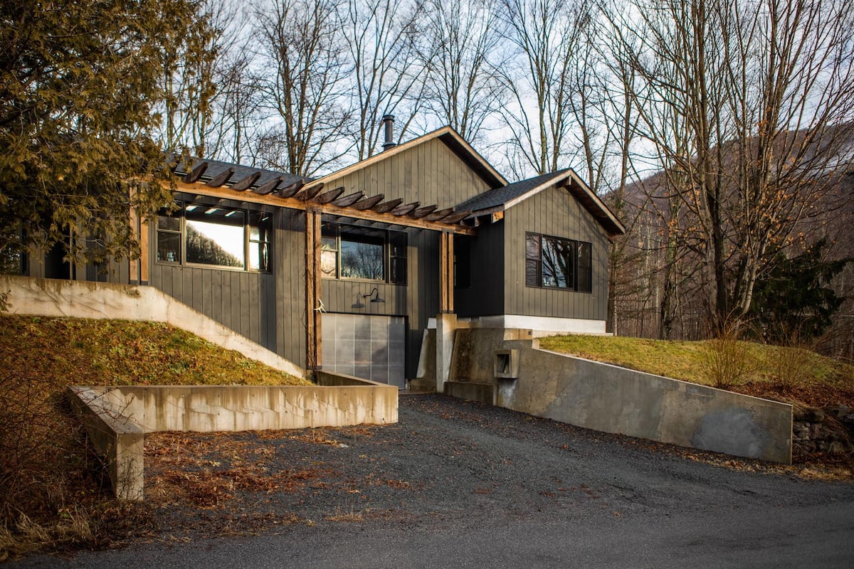 Moderna casa triangular con fachada de vidrio en las Catskills, con vistas panorámicas a la montaña. Relájate en la sauna privada de barril de cedro y en la refrescante ducha al aire libre, reúnete alrededor de la mesa de fuego de propano sin humo o enciende la parrilla de propano para cenas al aire libre. Un dormitorio elegante con vistas al bosque, sábanas de lujo, wifi rápido y una acogedora chimenea eléctrica combinan comodidad con diseño. A minutos de senderos, cascadas y mercados de agricultores, ideal para parejas que buscan una escapada serena y reparadora.