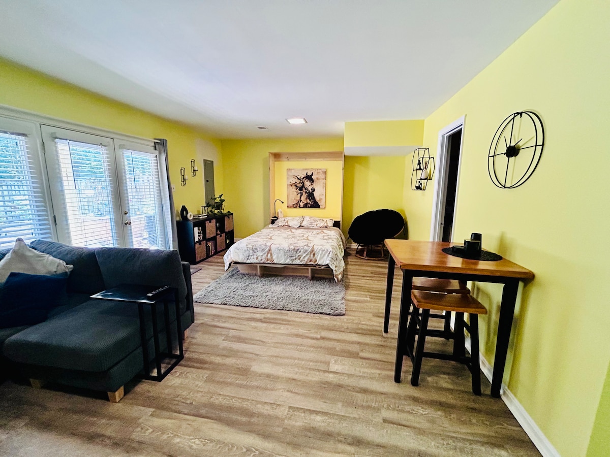 Bienvenido a este amplio y luminoso estudio en un nivel inferior en una casa dividida. Se accede a través de un camino pavimentado con ladrillo hasta una entrada privada sin escalones. Las paredes pintadas con colores vivos crean un ambiente tranquilo y una sensación de paz. La cocina pequeña te dará lo esencial para calentar tu comida con el microondas y para comer algo rápido. El alojamiento se encuentra en un hermoso barrio de Kingstown, VA, a pocos minutos de la estación de tren con cómodo acceso a Washington, DC.