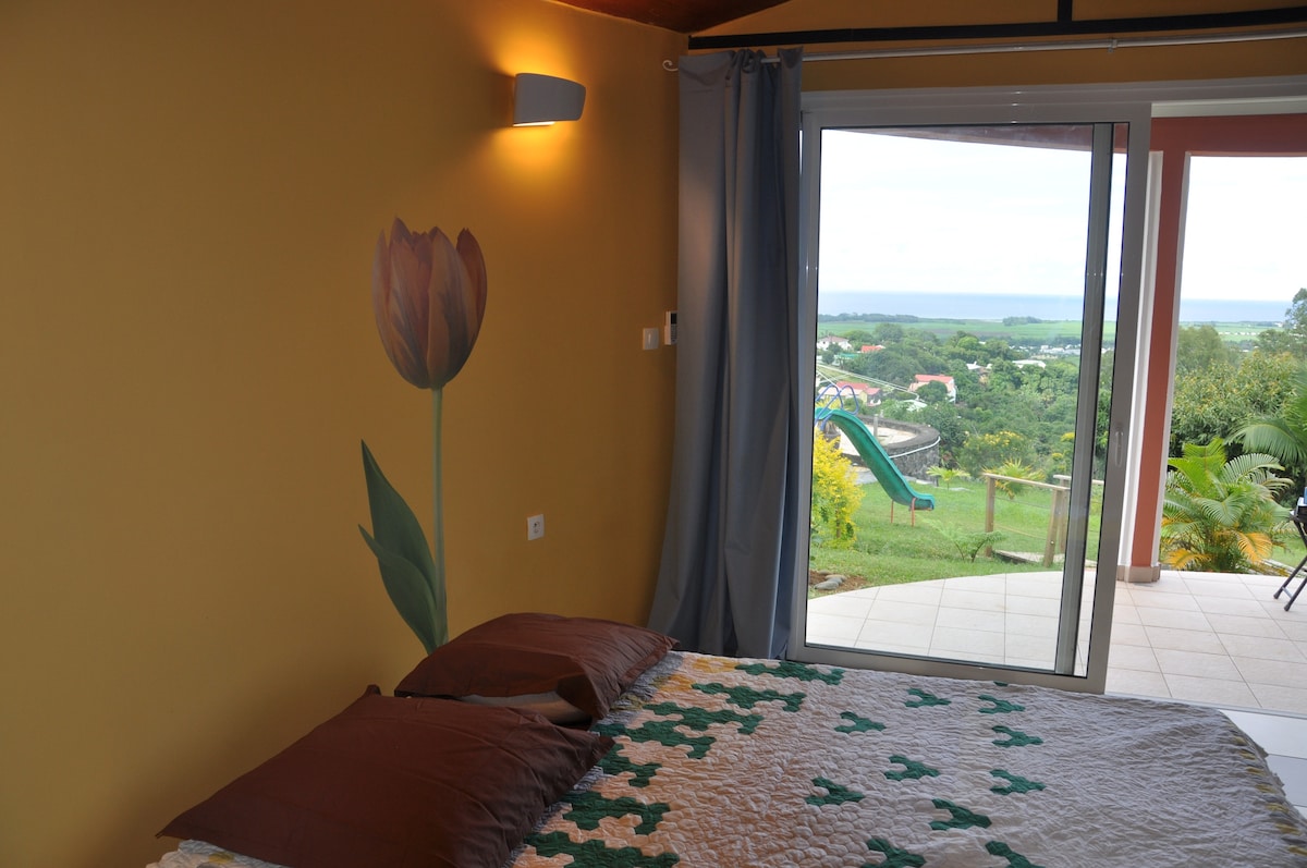 Studio de standing avec décor raffiné, tout confort, situé au rez de jardin d'une villa avec piscine. Grande terrasse avec coin repas et chaises longues donnant sur un beau jardin, vue sur le champ de cannes et la mer. Accès indépendant. Situé à 7 min de l'aéroport avec plusieurs sites touristiques à proximité (La Vanilleraie, Le Phare, La sucrerie de Bois Rouge, Cascade Niagara, nombreux bassins , etc). Localisation idéale pour visiter le nord, le cirque de Salazie et la côte Est.