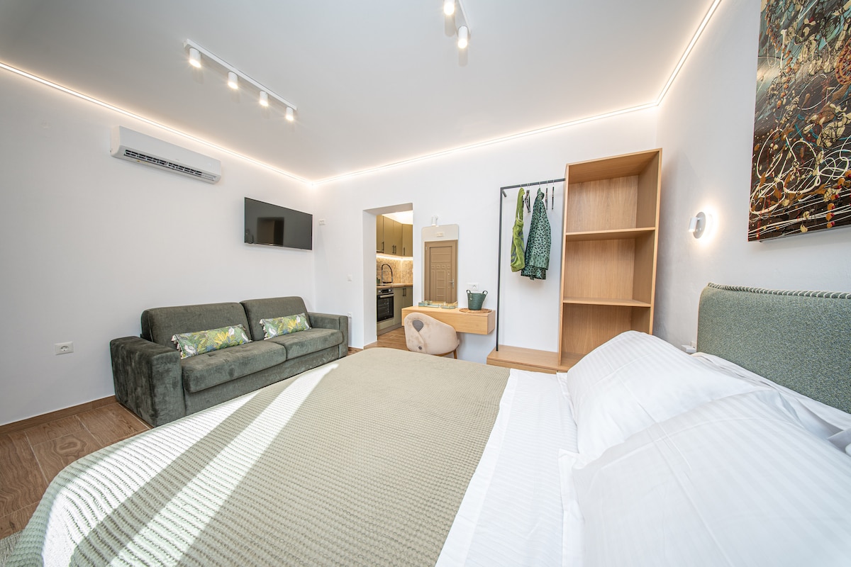 The “Veranda” Loft is located in the heart of Argostoli, just a 5-minute walk from the central square of the city. The veranda and balcony are the perfect spots to unwind—enjoy your morning coffee, read a book, or relax in the hammock while taking in the beautiful city views. We look forward to welcoming you!