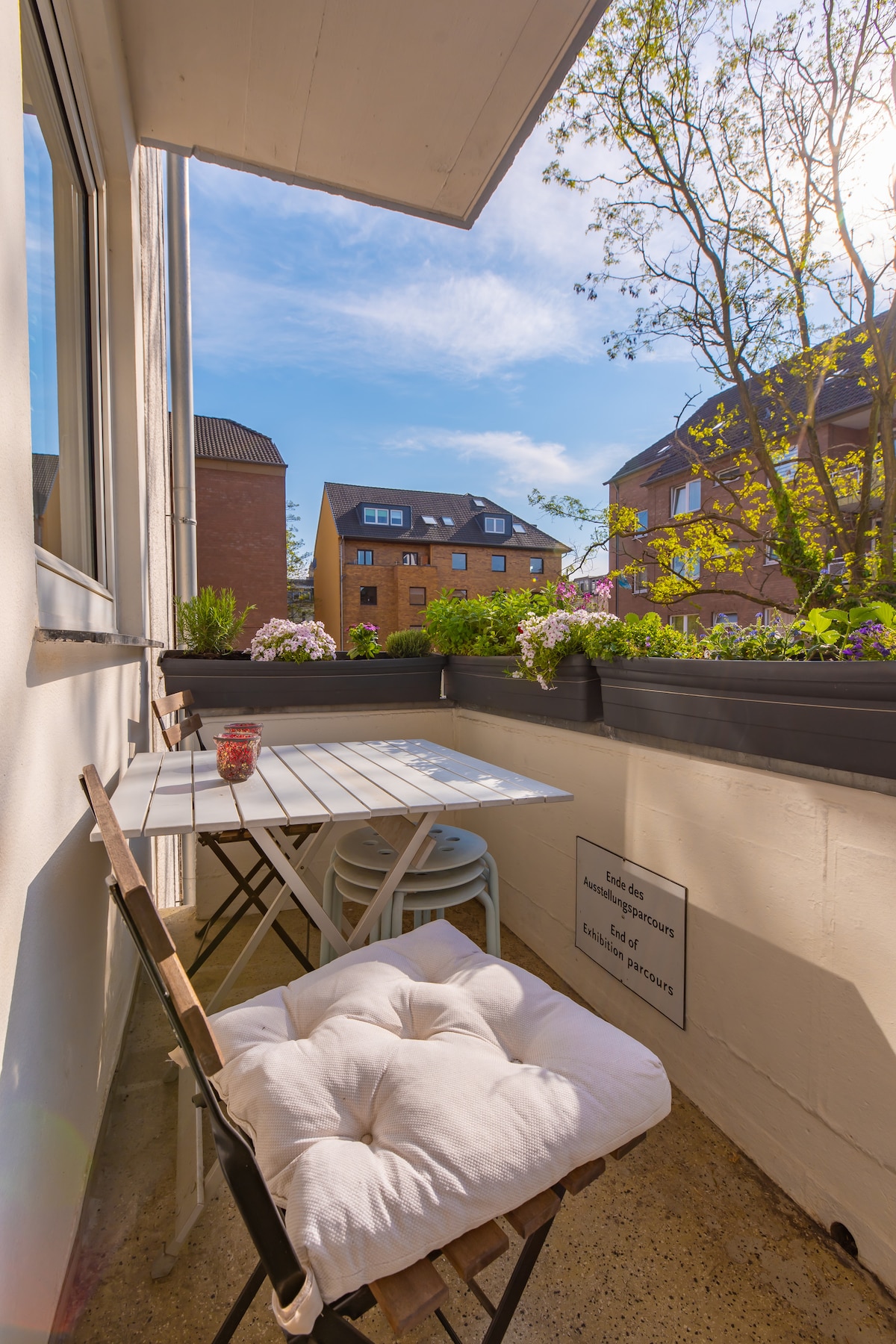 Willkommen im ZEHUUS! Gemütliche historische 40 qm große Wohnung im 1.OG mit großer Dachterrasse. Ruhiges Schlafzimmer zum Hof, vollausgestattete Küche, bequemes Kingsize-Bett mit Biolatexmatraze. Baubiologisch saniert, ausgewählte Designobjekte und echte Kunst. Im Sommer ist die Wohnung schön kühl auf Grund der massiven Wände. Restaurants, Bars und Cafes in unmittelbarer Nähe. Fußläufig zum Bhf Nippes, 3 Stationen zur Messe, 25-min. Spaziergang zum Kölner Dom.