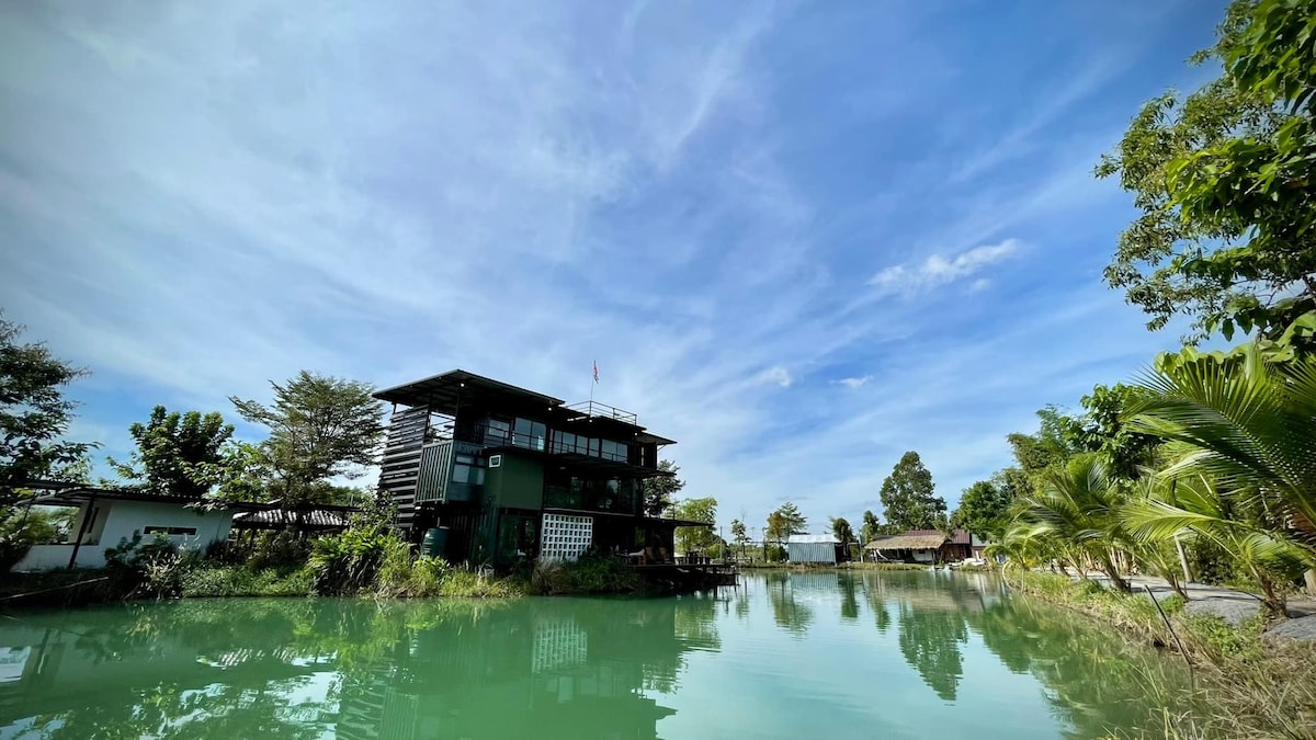 ¡Relájate y relájate en este espacio tranquilo y elegante! Nuestro lugar, Chacheongsao, tarda solo 1 hora en auto desde Bangkok. La casa flotante se construyó a partir del verdadero barco "IAM JUN", ubicado en un entorno verde y pacífico. Puedes ir caminando al río en 1 minuto.