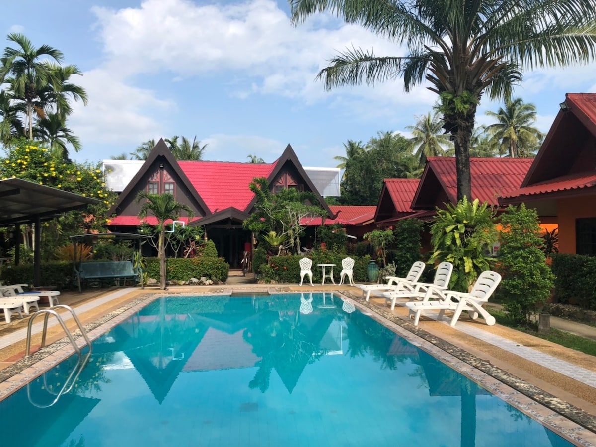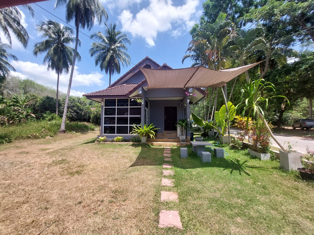 Ofrecemos una moderna casa de estilo bungaló con grandes ventanales sobre un paisaje pintoresco con una piscina natural, palmeras y muchas frutas y vegetación. El lugar es el destino perfecto para aquellos que buscan un lugar para escapar de la vida moderna y aún así tener toda la comodidad del aire acondicionado y wifi, a pocos minutos del centro de la ciudad de Krabi y las playas de Ao Nang.