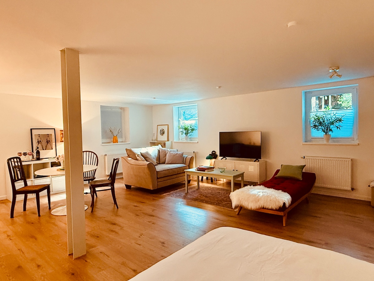 El apartamento se completó hace solo unos años en la ampliación de una casa de ladrillo y se renovó creativamente en 2020. Tiene su propio baño pequeño, una cocina-sala de estar con una cama y un sofá cama y una cama doble en la zona superior, a la que se puede acceder por una pequeña escalera. Después de cada huésped, una pequeña empresa de limpieza realiza la limpieza de acuerdo con las normas de AIRBNB relativas a la COVID-19.