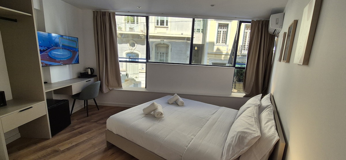 Una habitación luminosa y cómoda con un diseño moderno y limpio y tonos neutros suaves, que ofrece una estancia acogedora en el corazón de Atenas. Disfruta de una cómoda cama doble, pisos de madera, un moderno baño con ducha, aire acondicionado, conexión Wi-Fi gratuita y una nevera para tus artículos esenciales. Los grandes ventanales enmarcan las vistas de la ciudad y llenan la habitación de luz natural. Comienza el día con café de cortesía en el vestíbulo y termínalo en la azotea con vistas panorámicas y un relajante jacuzzi.