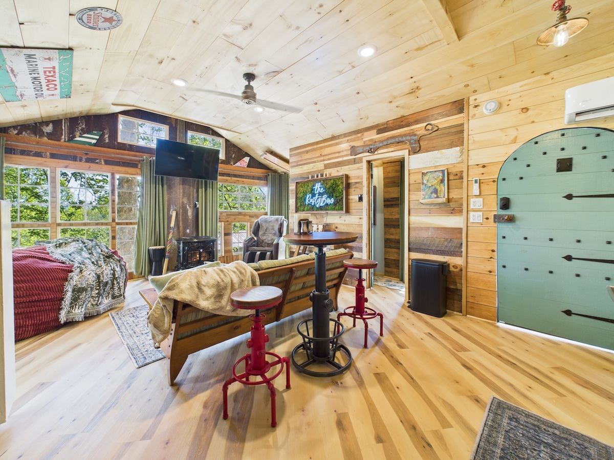 Escápate a nuestra única cabaña nórdica con ventana en la cima de un árbol enclavada en un sereno bosque de 22 acres. Disfruta de impresionantes vistas al bosque desde amplias ventanas, relájate junto a la chimenea de gas y cena en la mesa de picnic. La casa de baños independiente ofrece un toque de lujo, mientras que una hamaca invita a la relajación entre los árboles. Con una ubicación céntrica, estás a solo 5 minutos de Helen alpina y cerca de cascadas, viñedos, senderismo y pesca.