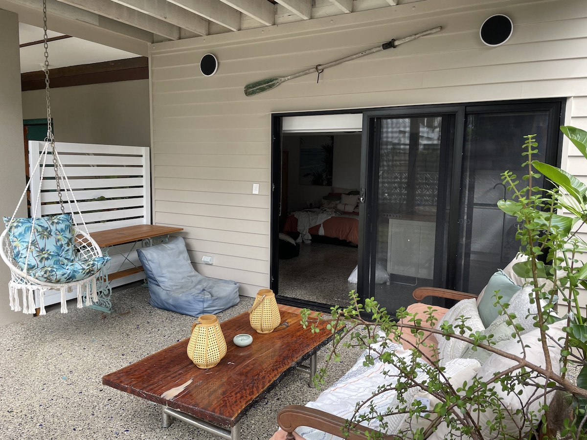 Rompe con tu día a día y relájate en este oasis de tranquilidad. May's es uno de los dos apartamentos totalmente independientes dentro de este edificio. Cada apartamento tiene su propia entrada y puedes disfrutar de tu exclusivo baño de piedra exterior, relajarte frente a la chimenea interior, acurrucarte en la cama tamaño king o descansar en la hamaca. Esta hermosa propiedad de matorrales tiene acceso a la bahía de Moreton con marea alta, está a 10 minutos en coche de las playas de Straddie y a 15 minutos de Brown Lake. Te sentirás como si estuvieras en otro mundo.