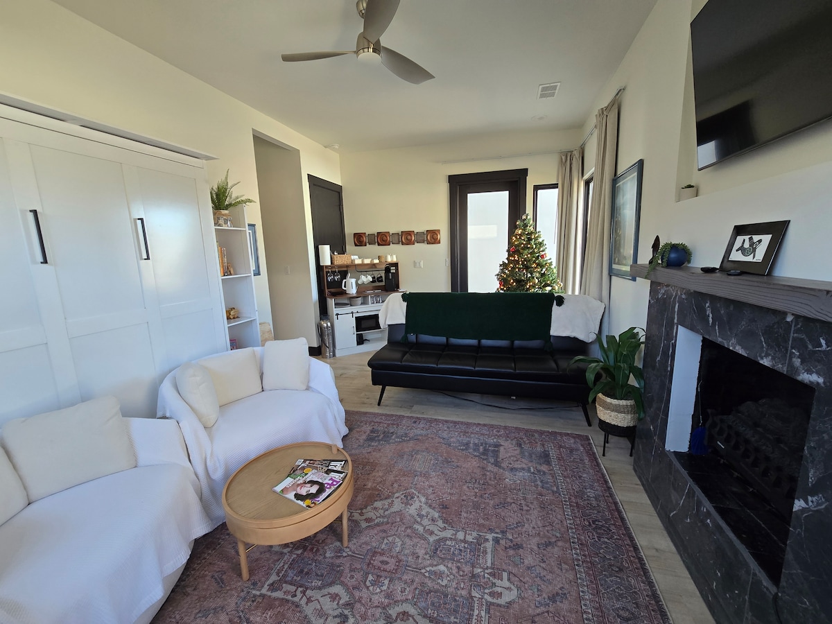 Disfruta una experiencia elegante. Suite de dos habitaciones con un dormitorio, sala de estar y baño privado completo. Tiene capacidad para 4 adultos. Hay una entrada privada a la suite. Cama tamaño king, vestidor y vestidor, mesas auxiliares, ventilador de techo con luz y un sistema de filtración de aire. La sala de estar tiene una cama tamaño queen Murphy, cafetería y vinoteca con microondas, mininevera, cafetera (café y té incluidos) y platos y utensilios. El baño es al estilo Jack y Jill con 2 tocadores y ducha de pie.