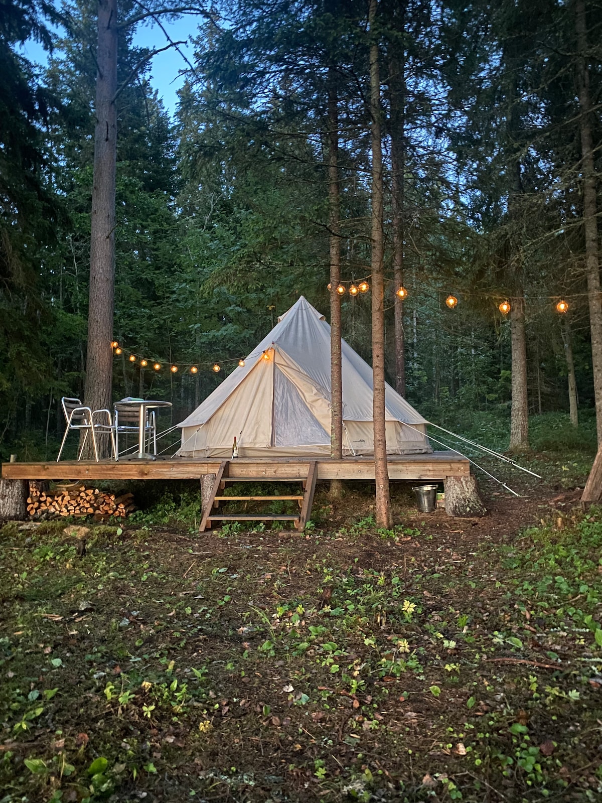 Con una hermosa vista sobre el lago, en medio del bosque, una gran carpa de 20 m2 que puede alojar hasta 4 personas. Cuenta con dos cómodas camas reales: 140×200 y 120×200, con dos almohadas y una cobija cada una. Puedes traer tu saco de dormir. La tienda de campaña está climatizada con una estufa de leña para noches frescas. Usted puede cocinar en un fogón exterior, proporcionamos ollas, sartenes, cubiertos, y también madera y agua de nuestra fuente. Tienes acceso gratuito al lago y a las canoas, y sesiones gratuitas en la sauna.
