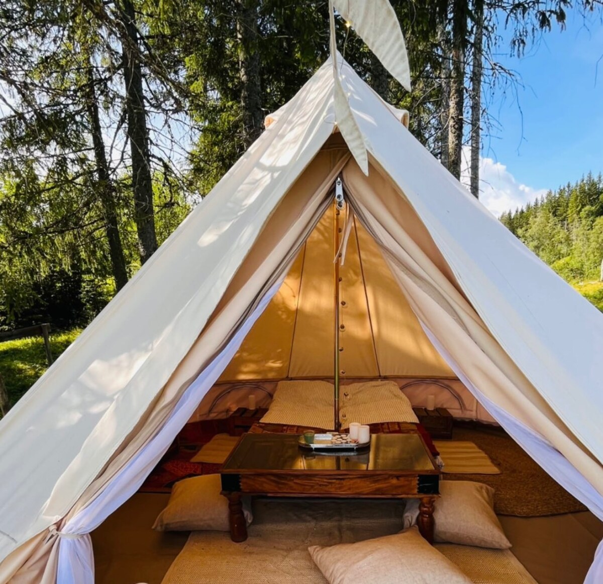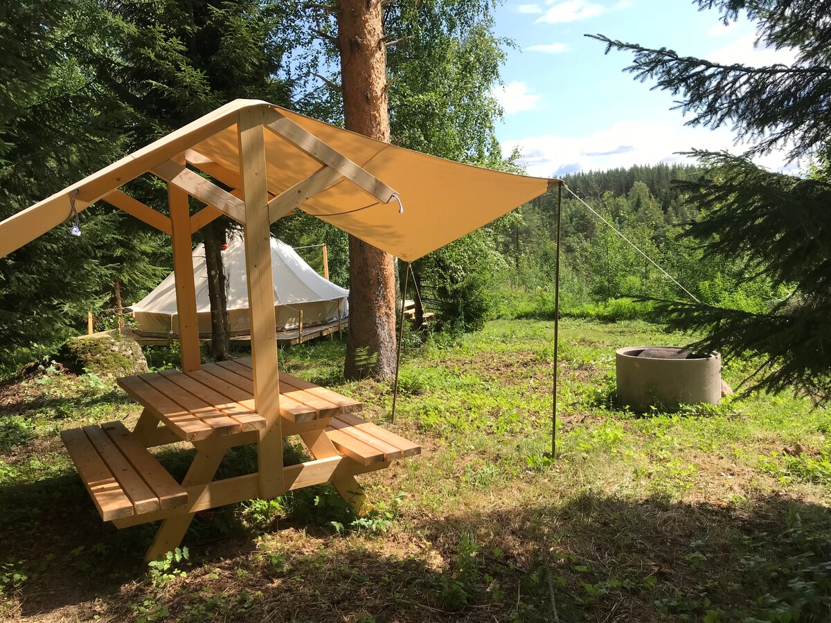 Te damos la bienvenida al lugar Hvergelmir. Un oasis único en el paisaje de cuento de hadas: Hälsingland. Desaparece por completo en la calma de la naturaleza y desconéctate del insoportable estrés de la vida cotidiana. En un arroyo balbuceante en una cresta cubierta de pinos, te alojarás en una espaciosa tienda de campaña de lujo envuelta por la hermosa naturaleza. En este lugar único, tienes la oportunidad de bañarte en el jacuzzi de leña, sudar en la sauna de tierra y cocinar en una hoguera. ¡Cualquier cosa para que tu estancia sea lo más auténtica, relajante y tranquila posible!