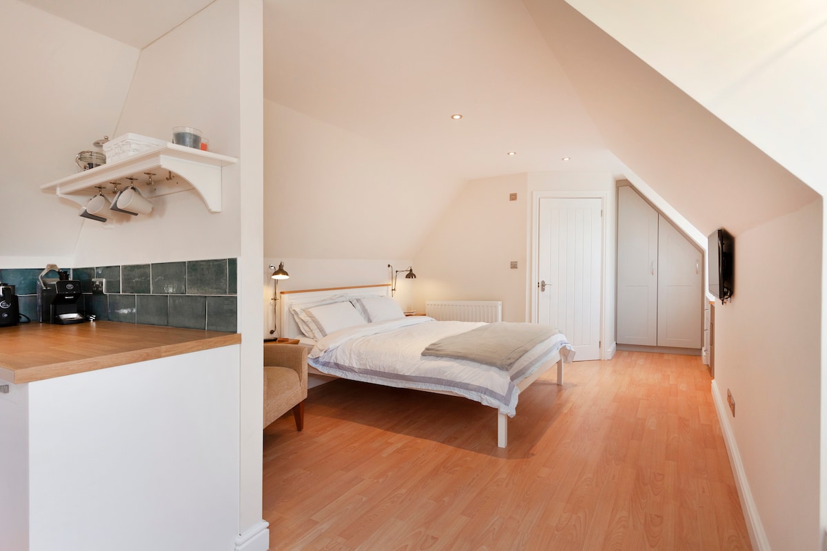 Suite de lujo y totalmente privada con baño y cocina americana, situada en un impresionante y tranquilo jardín, separada de la casa con entrada privada propia. Completa con wifi, TV, lavandería y aparcamiento seguro fuera de la calle. A poca distancia a pie de los servicios locales, pubs del pueblo y hermosos paisajes, paseos y carriles bici a lo largo del río a solo minutos de distancia. Cama individual adicional y cuna de viaje disponibles si es necesario.