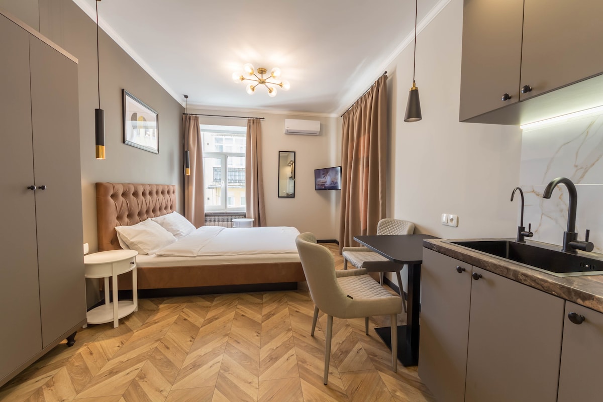Me gustaría darte la bienvenida a este lujoso miniestudio, recién renovado en 2021 en el centro de Kiev. La cama grande y el colchón (160x200) están diseñados a medida por un proveedor de los principales hoteleros. Las ventanas del apartamento tienen triple acristalamiento, por lo que a pesar de estar en el centro de la ciudad, el apartamento es muy tranquilo. La Cocina esta totalmente equipada La lavadora está a tu servicio, además de suministro de detergente. La ducha moderna y limpia se suministra con champú/gel líquido. Llegada fácil y sencilla a partir de las 14:00 h.