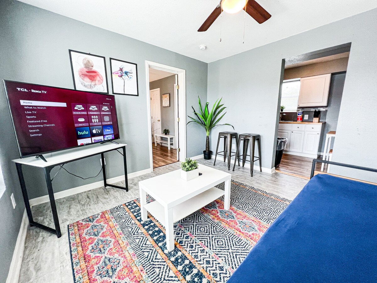 Refreshed 650 sq. ft. 1BR/1BA cottage, private side entrance near the garage. Located in a quiet, established area. Features a serene backyard oasis. 25 miles to Port Aransas beaches, 15 mins to Bob Hall Pier, Whitecap, & Mustang Island, and 10 mins to the Texas State Aquarium, USS Lexington, and TAMUCC. Dog-friendly only (max 2, no other pets). Street parking available only. Permit ID: 001632. Living Room TV: Spectrum Bedroom: Streaming