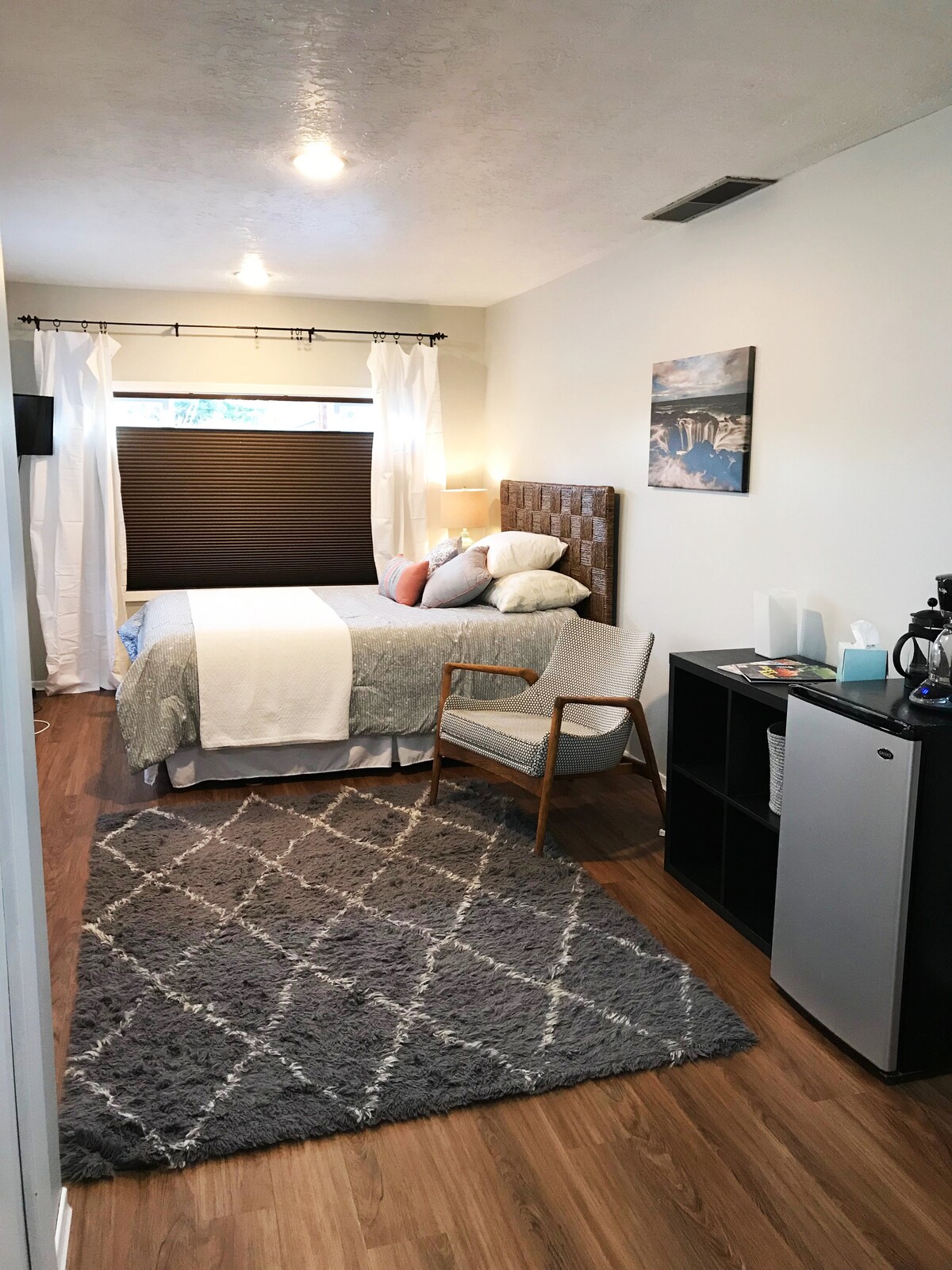 Ubicado tranquilamente en un hermoso entorno, este dormitorio artístico incluye estufa, horno, microondas, cenador, entrada privada, patio cercado, internet, aire acondicionado, baño y una hermosa vista al jardín. Es un espacio de 450 pies cuadrados con una cama tamaño queen. No se permite fumar, niños, mascotas ni fiestas de ningún tipo en ningún lugar de la propiedad. ¡Esperamos tu visita! -Evan y Hannah