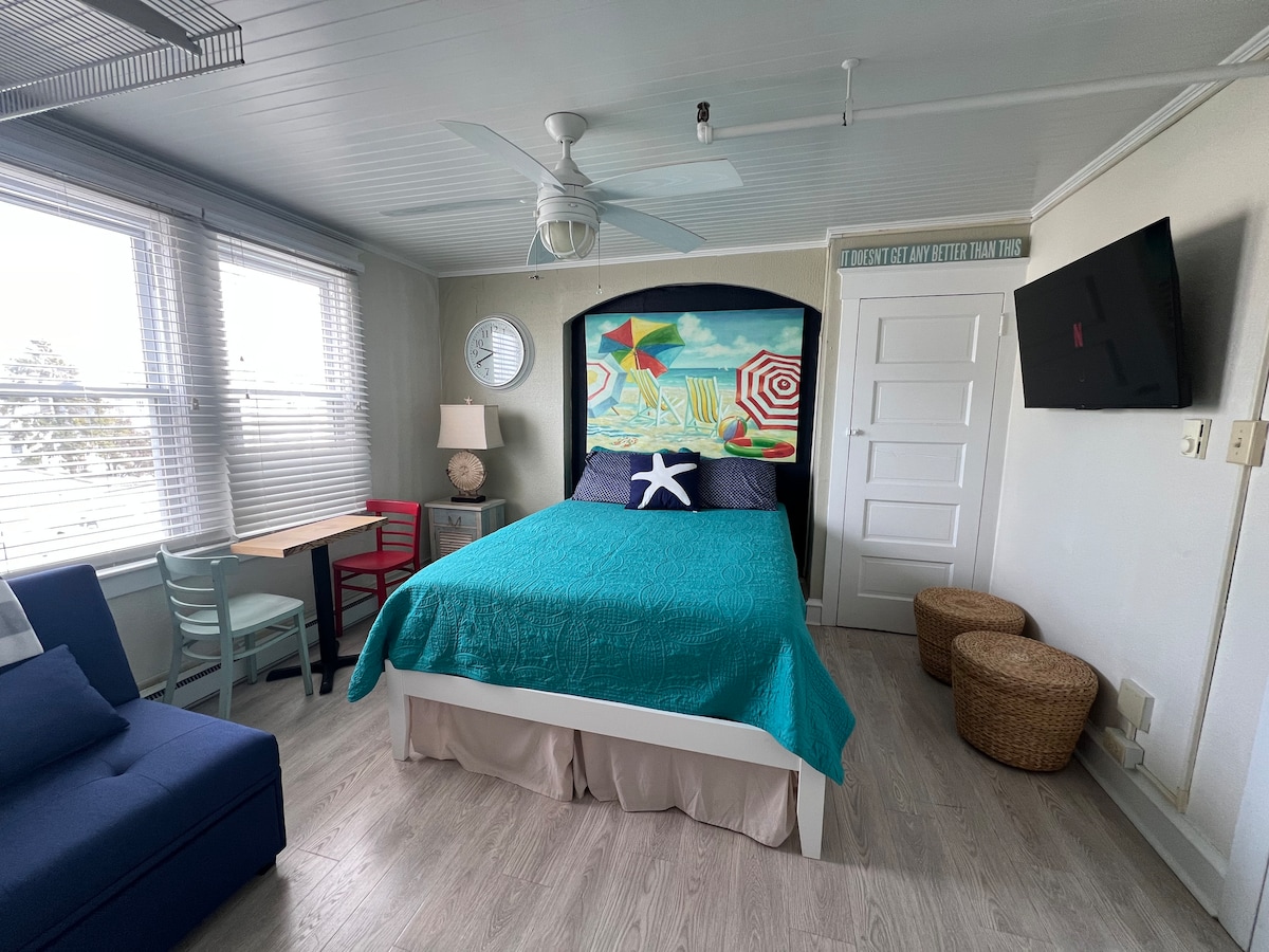 ¡Unidad de estudio en un centro privilegiado de la ciudad, la playa y el paseo marítimo! ¡Literalmente a pocos pasos de la playa! No se necesita coche... ¡A poca distancia a pie del centro de OC con muchas opciones de comida y entretenimiento! Acogedora unidad temática de playa con capacidad para 3 personas. Baño completo privado y cocina pequeña con sábanas, toallas de baño, platos, utensilios, placa de cocina pequeña, mini fridg, microondas, cafetera Keureg, café, tostadora... Estacionamiento gratuito en la calle o estacionamiento de pago al lado. Lavandería. Tiene ascensor. Viaje compartido a Summers Point, Atlantic City...