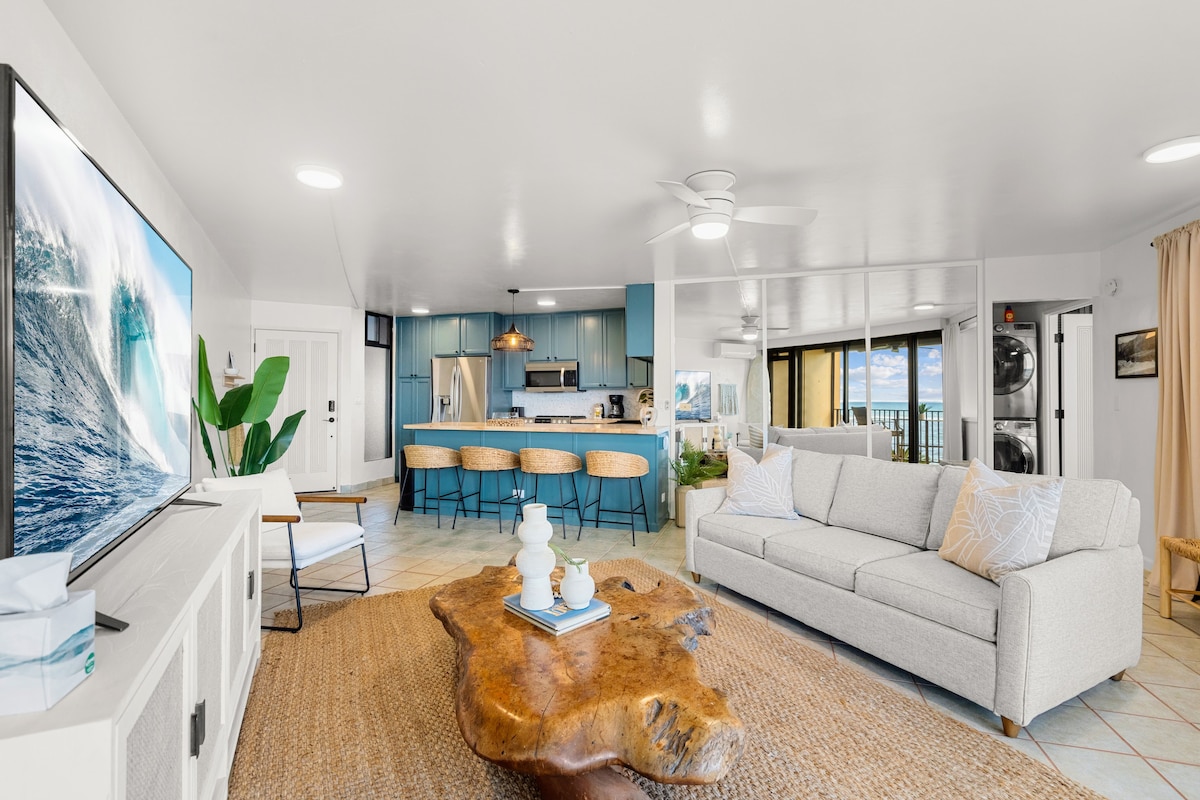 Disfruta de las vistas panorámicas al mar directamente desde el salón. Esta maravillosa unidad de planta baja ofrece privacidad y tranquilidad con amplias vistas al mar, donde podrás disfrutar de avistamiento de ballenas de temporada, paddle surf, surf, esnórquel y muchas otras actividades a las puertas de tu alojamiento. La unidad también está junto a una de las playas más largas de Maui, Sugar Beach. Y justo al final de la carretera encontrarás excelentes tiendas, restaurantes, vida nocturna y el Centro Oceánico de Maui.