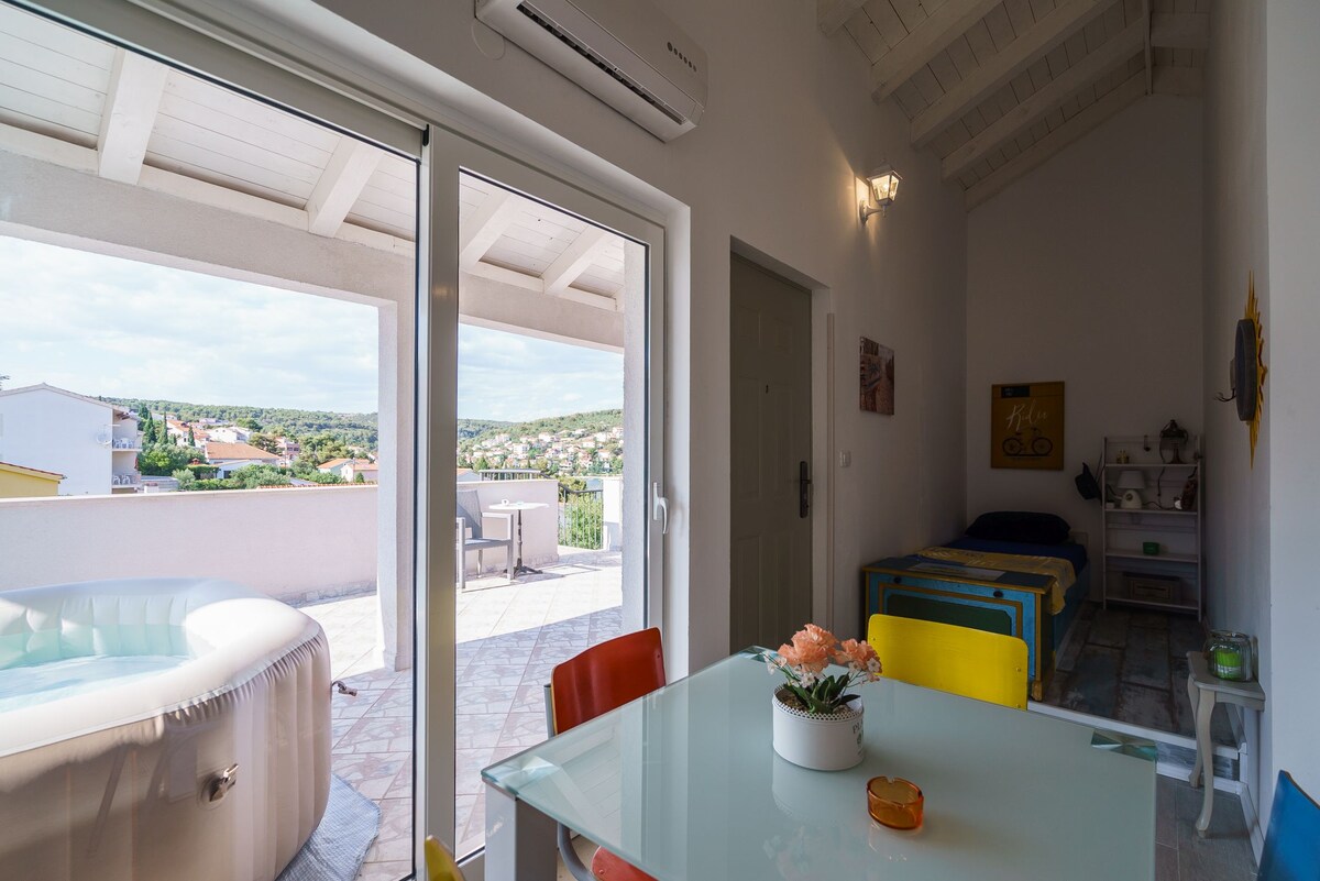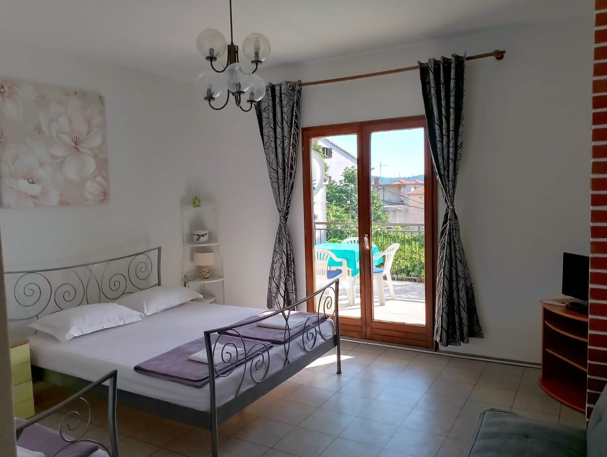 Apartamento tipo estudio para tres personas, ubicado en una casa familiar en un vecindario tranquilo. La playa está a sólo 100 metros de distancia, el centro de Trogir 3 km. La tienda está a 100 metros, también hay una playa de 4 km con bares y restaurantes. Hay una línea de ferry, que corre en el paseo marítimo en el centro de la ciudad cada 20 minutos, ubicada en la playa a 100 metros del departamento. El anfitrión proporcionará un 20 % de descuento en un viaje en barco y un 10 % de descuento en canchas de tenis en un club de tenis local.