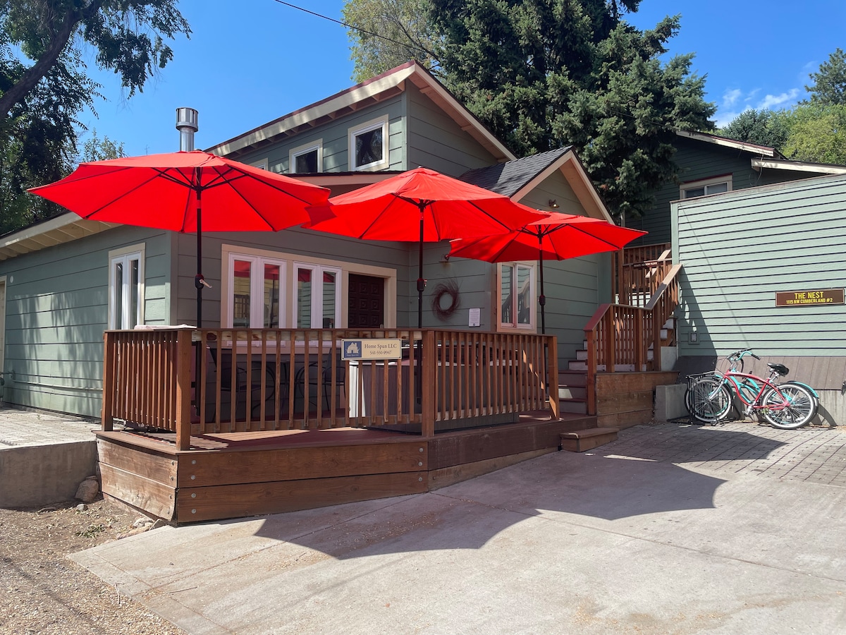 Esta histórica casa de campo de Old Town Bend cuenta con un entorno relajante para relajarse con un encantador jacuzzi de cedro y sauna en su casa de carruajes restaurada. Camina hasta las atracciones: 0,2 millas a las mejores tiendas y restaurantes, y 0,4 millas a Mirror Pond y Drake Park. Calefacción dividida en cada habitación, almacenamiento de equipo de nieve, calentador de botas, parrilla y lavadora/secadora nueva. Estacionamiento en la entrada y en la calle (gratuito). Wifi rápido y un televisor inteligente. La cocina está totalmente equipada y esperamos tu llegada.