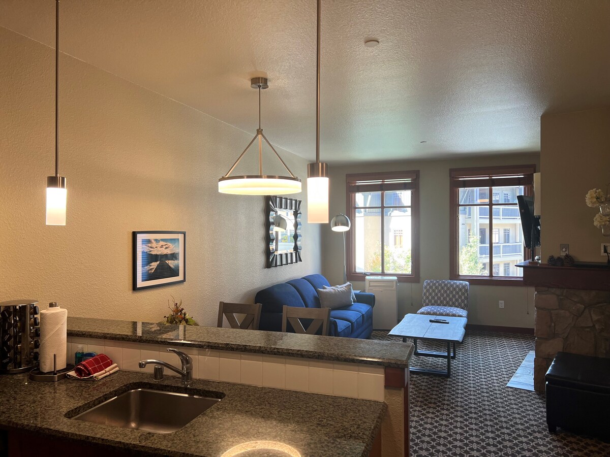 Perfect summer location overlooking event plaza and Ski In, Ski Out convenience in the Winter. Imagine, soaking up the rays on your balcony, with a front row seat for all the entertainment & activities below. Or stay warm in the winter by the cozy indoor fireplace. Charming 1 bedroom condo with everything you need. Furniture and lighting recently updated. Walk downstairs to the restaurants, shops, events and gondola. Condo has 1 King Bed in Bedroom and 1 pull out sofa bed in living room.