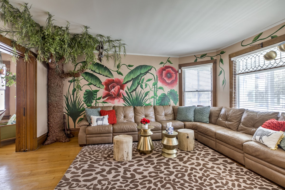 The Zoo House es la primera casa de alquiler vacacional temática de la selva de Omaha. Quédate la noche o la semana en la selva que destaca algunas de las famosas atracciones del zoológico Henry Doorly de Omaha, como una sala de mariposas, una sala de acuario y mucho más. Desayuna con los monos y ríete toda la noche con las jirafas que anidan en nuestra sala de estar. Ahora aceptamos reservas. ¡Envíanos un mensaje!